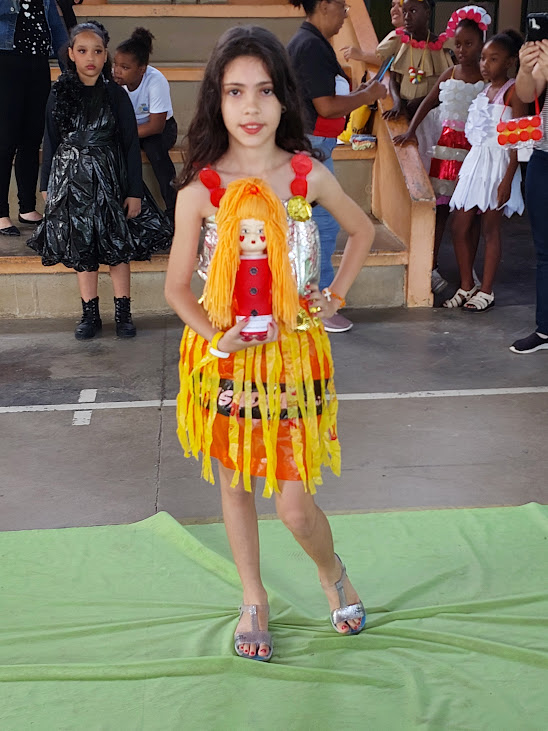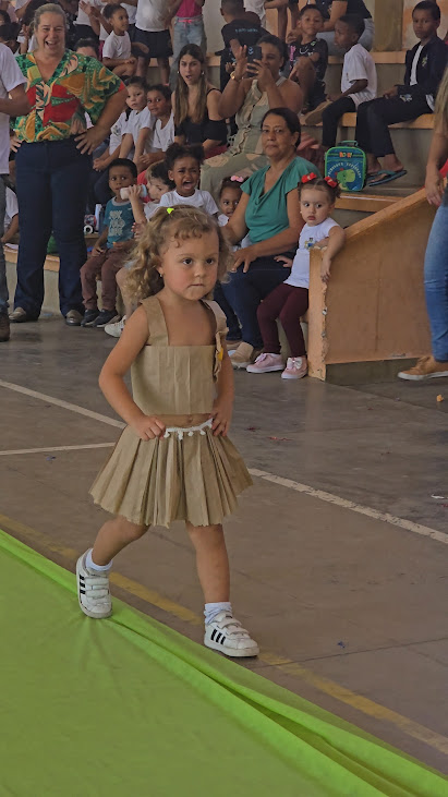 A top model mirim passando pela passarela com desenvoltura e exibindo com criatividade a criação em material reciclável