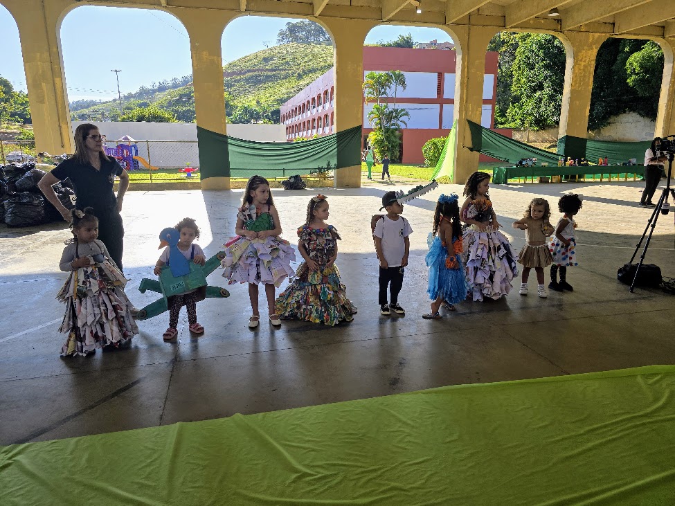 Uma fila de pequenas modelos apresentando suas criações para participar do ‘Desfile de Roupa Reciclável’, que foi um grande sucesso no evento
