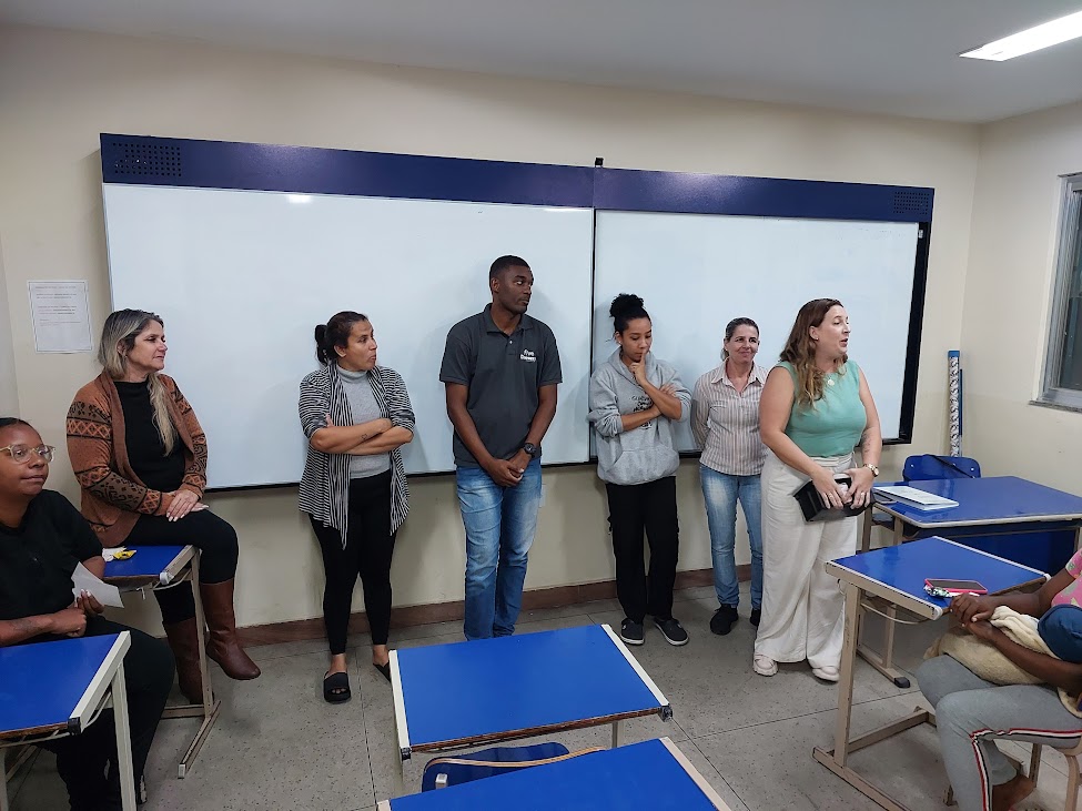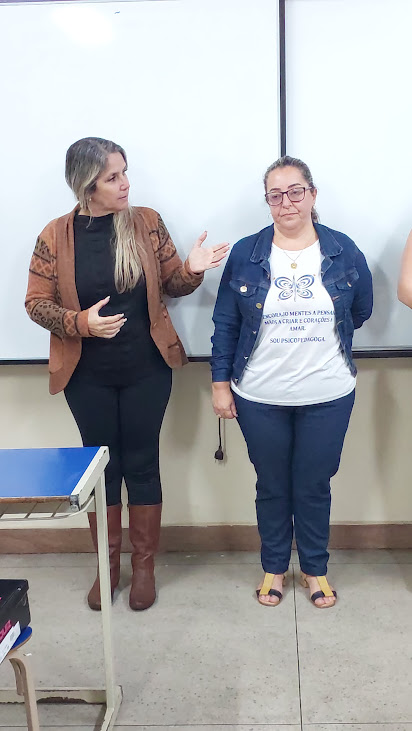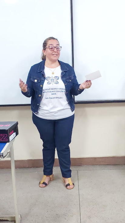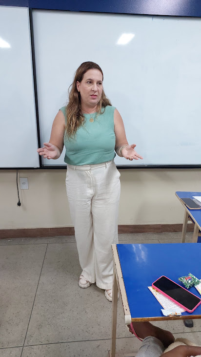 Observada atentamente pela secretária Claudia Vogas, por mães e pai dos estudantes, a psicóloga Paula Reis dá sequência à sua palestra