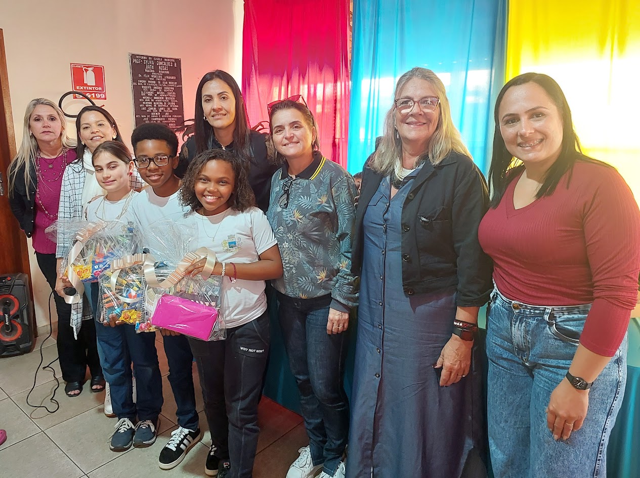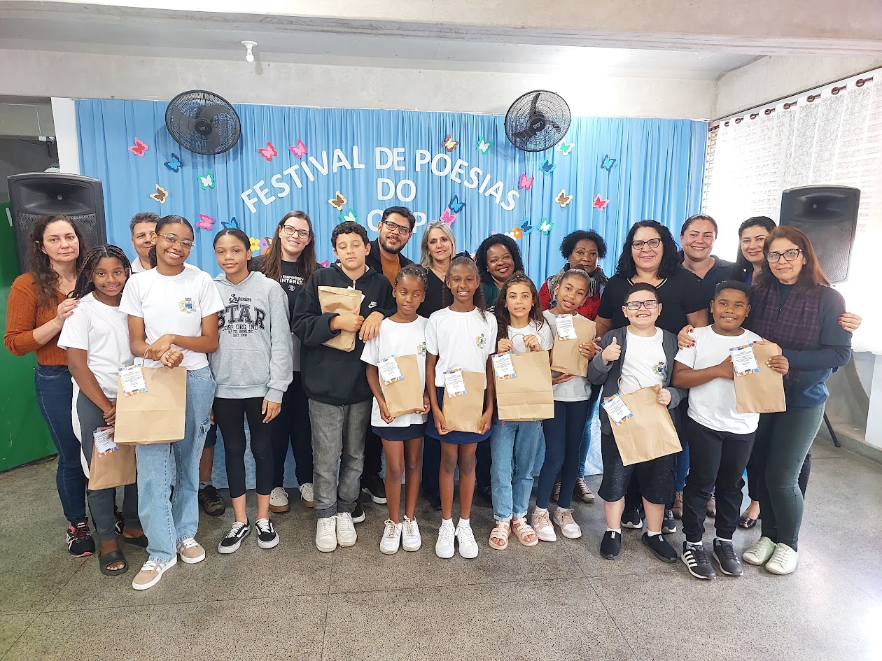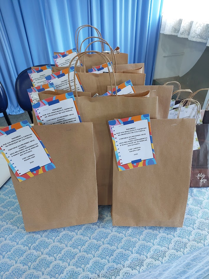 Junto dos brindes oferecidos aos agraciados, mensagem de apoio aos esforços e criatividade dos pequenos poetas e poetizas