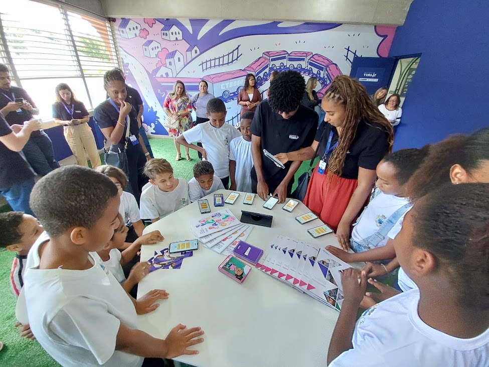 Garotada conferindo o funcionamento dos celulares que serão utilizados no ‘Jogando com Vini’ para responder questões de matemática, português e ciências