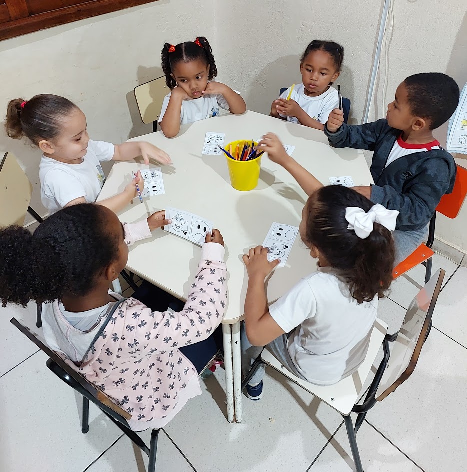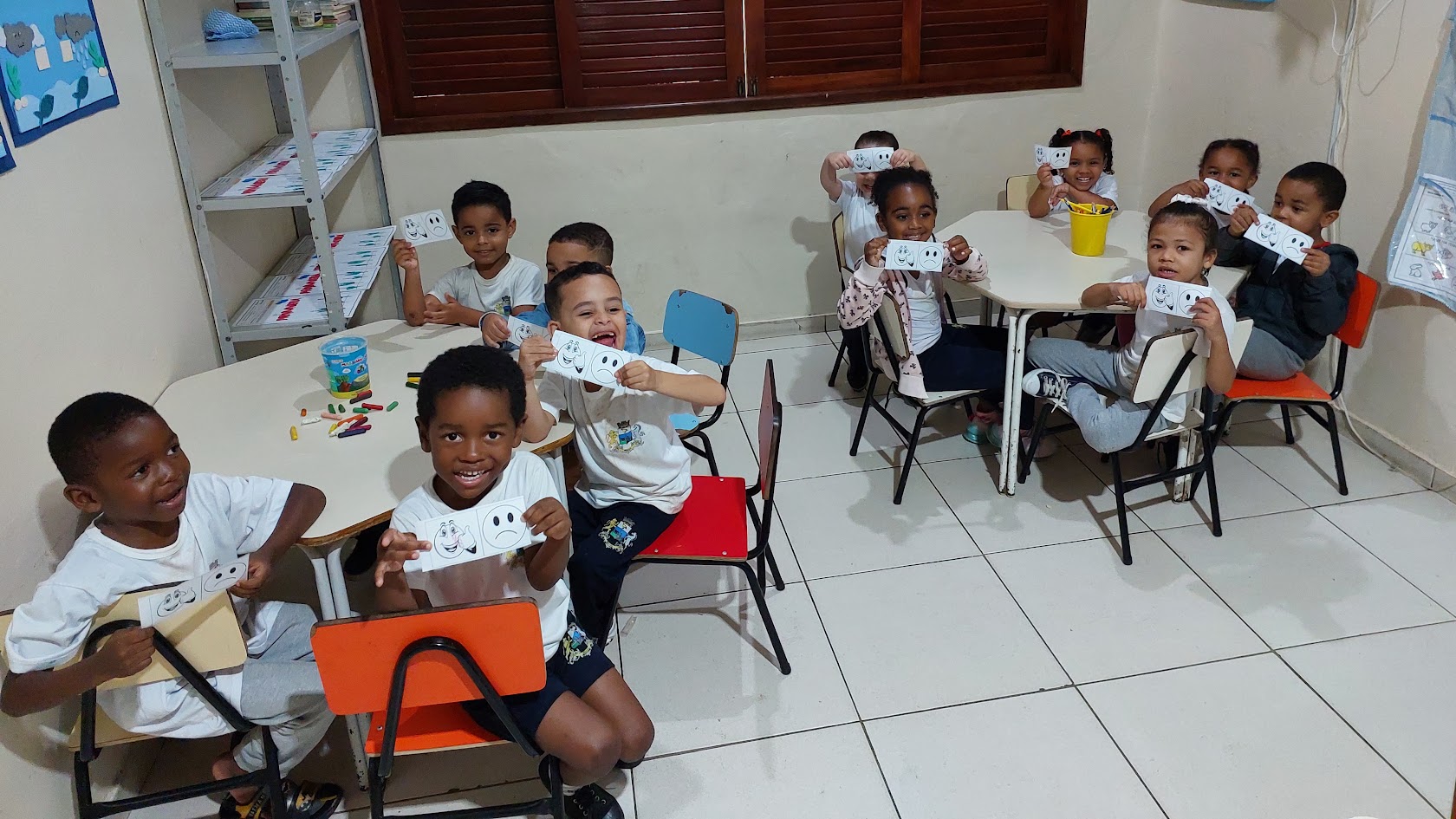 Já para os pequenos estudantes da Educação Infantil as questões chegam de forma simples e eles respondem com ludicidade expondo as carinhas aprovando ou não