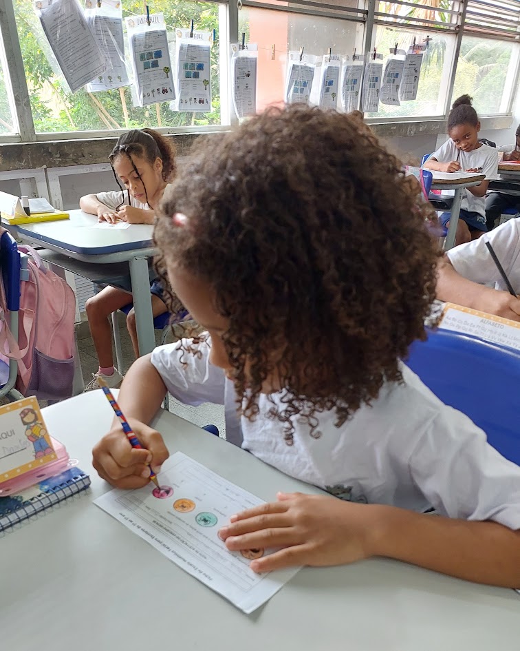 Concentrada na atividade, a aluninha responde às questões do teste com atenção e sabendo que sua opinião sobre o cardápio faz toda diferença