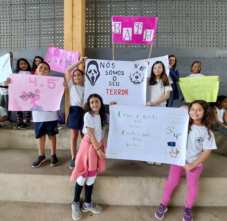 Cartazes da comunidade escolar presentes nas torcidas incentivavam suas escolas e demonstravam a participação popular durante o evento