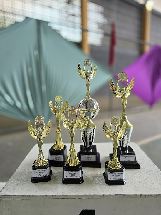Os troféus tão cobiçados ficaram expostos para que fossem entregues logo após a Solenidade de Encerramento da Olimpíada Estudantil Municipal de Macuco