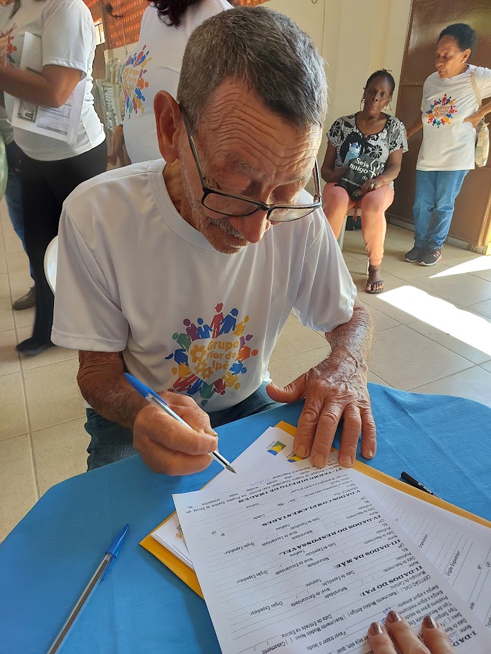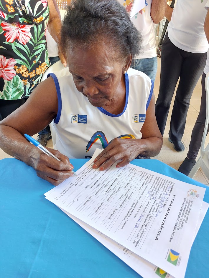 Mais um dos idosos beneficiados pelas atividades oferecidas pela Secretaria de Envelhecimento Saudável preenchendo sua ficha de inscrição para participar do EJA