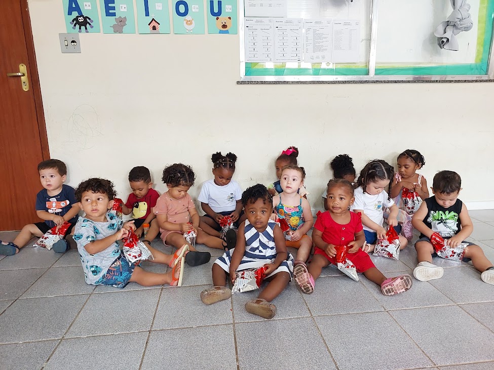 Bem à vontade no chão da creche, palco de tantas brincadeiras divertidas, os pequenos se juntaram para abrir os presentinhos trazidos pelo Papai Noel