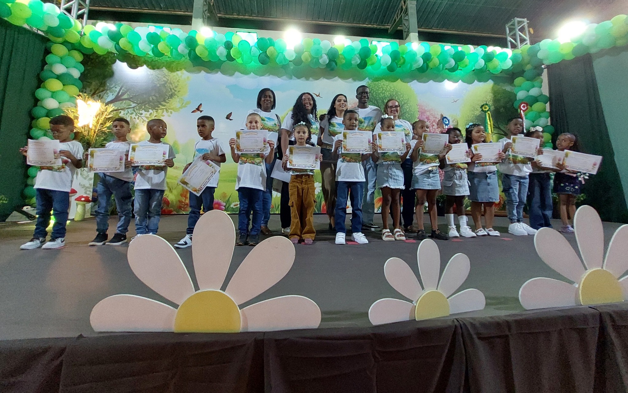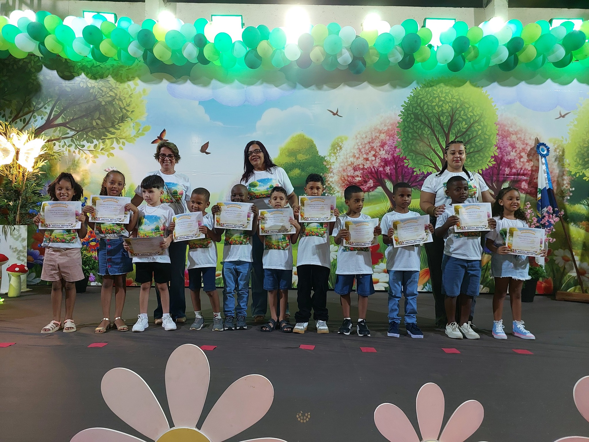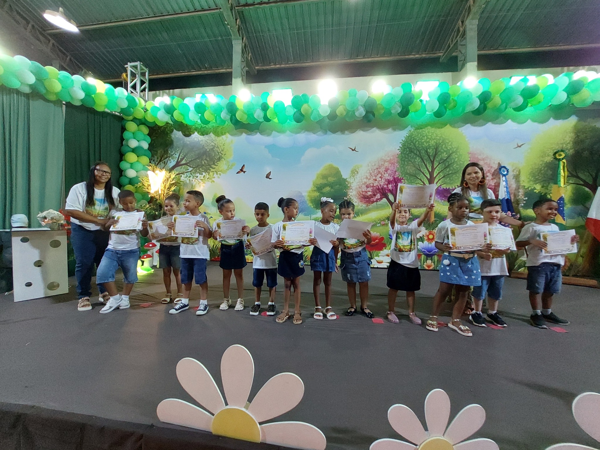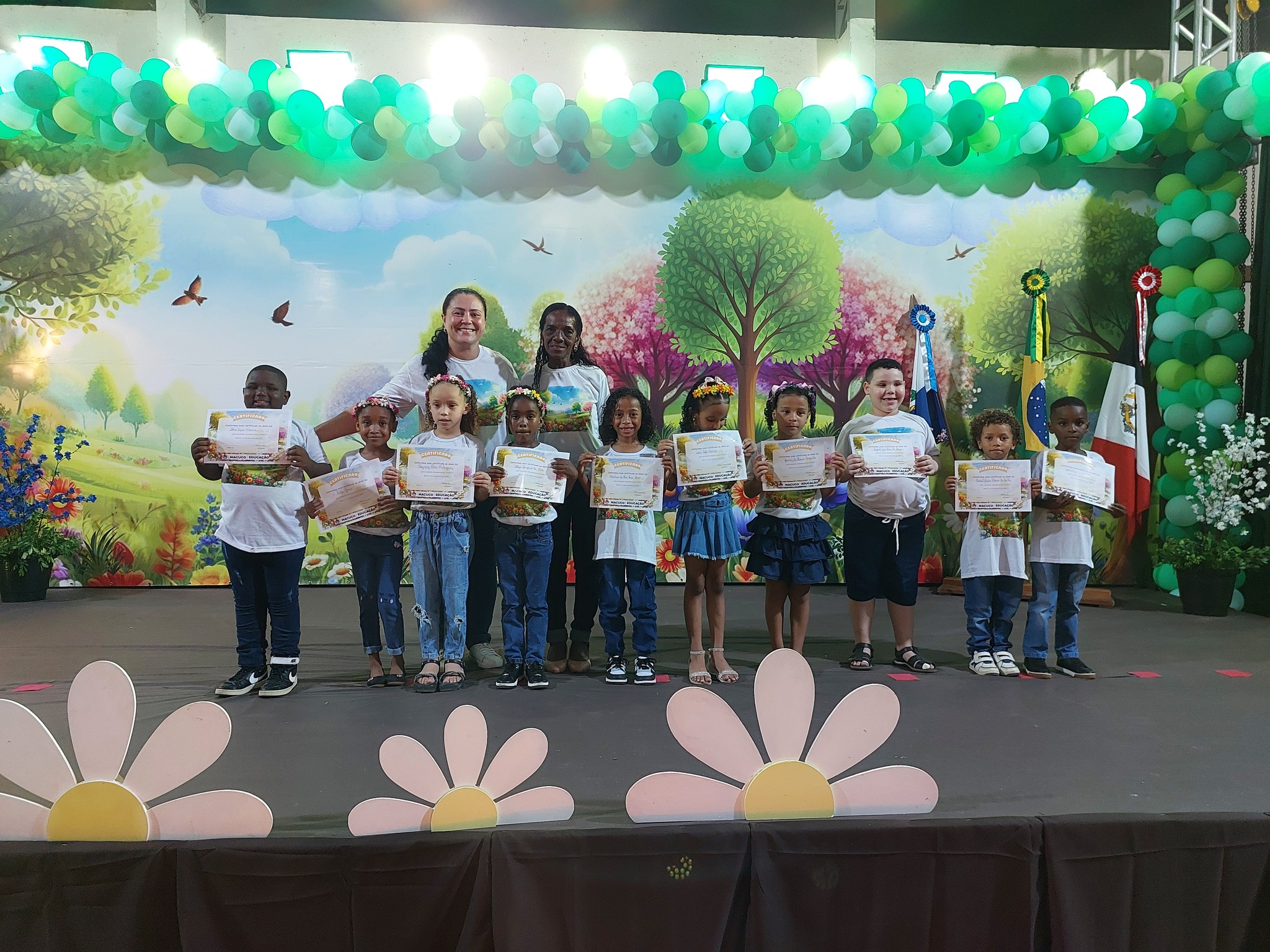 A entrega dos certificados reforçou a metáfora do ‘Jardim Encantado’, lembrando que cada criança floresceu com amor, cuidado e descobertas ao longo do ano, simbolizando o fim de uma etapa mágica e o início de novas aventuras. O Juramento Oficial, com todos de pé e o braço direito estendido, trouxe solenidade ao momento, seguido por um belo espetáculo do Grupo Agitação, mais uma vez brilhando intensamente e expondo o quão criativas são as programações da Secretaria de Educação.