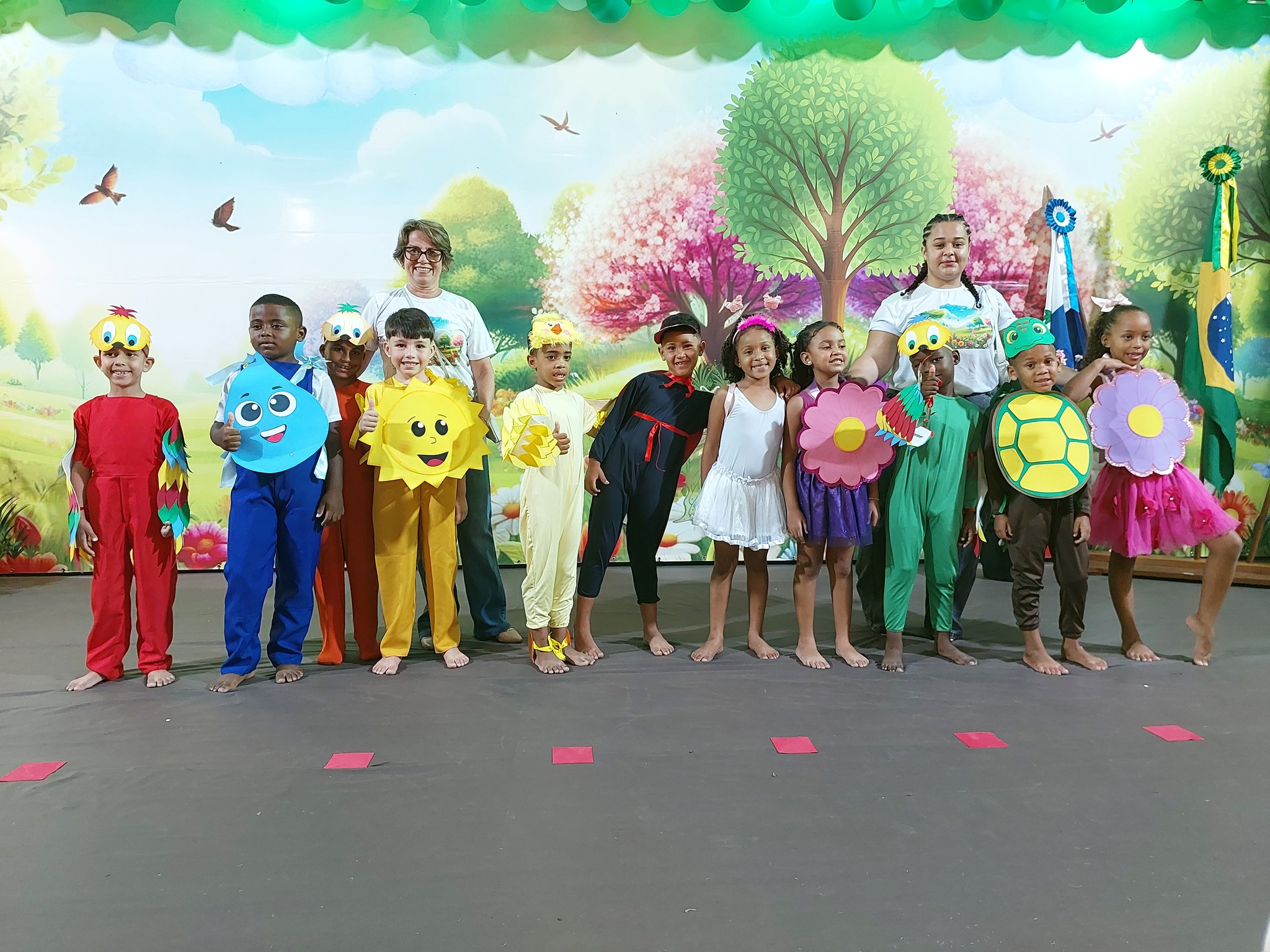 Orgulhosas, as professoras acolheram seus pequenos artistas no palco para mostrar o apoio que os pequenos tem no dia a dia da comunidade escolar