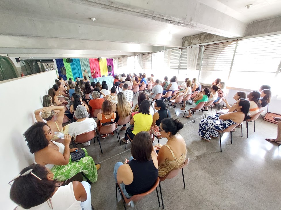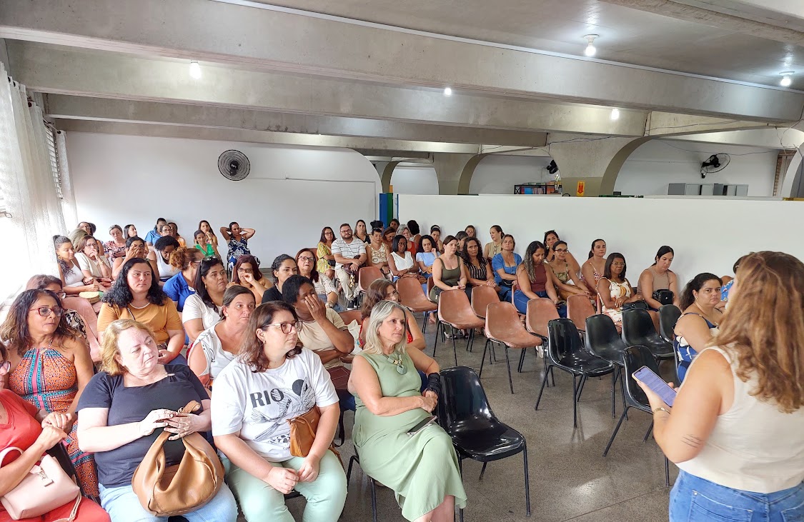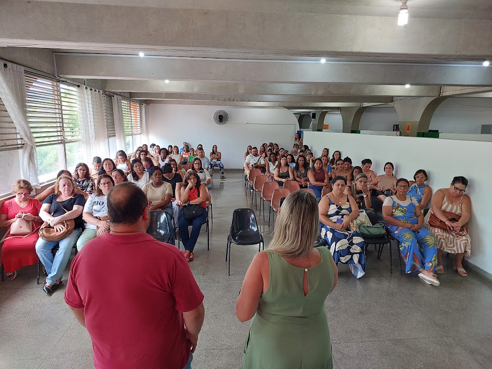 Grupo de educadores acompanhando os discursos de boas-vindas do vice-prefeito João Batista e da secretária de Educação Claudia Vogas (ambos de costas)