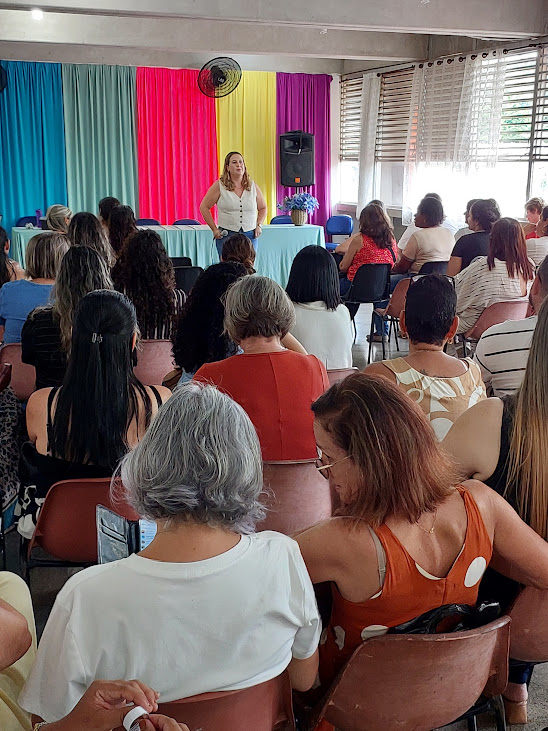Num movimento de valorização do bem-estar do professorado, a psicóloga Paula Reis ministrou uma palestra sobre os cuidados com a saúde mental no dia a dia