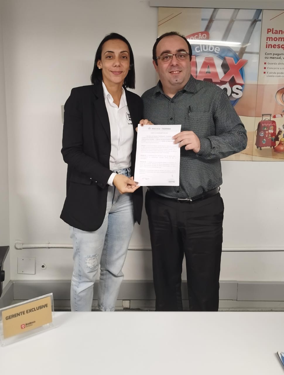 Coordenadora da Sala do Empreendedor de Macuco ao lado do representante do Bradesco, gerente Geraldo Tavares