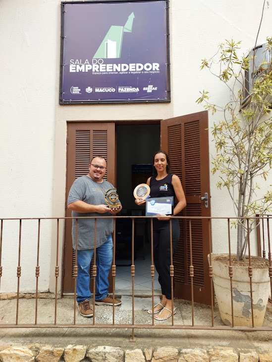 Vice-prefeito João Batista e a coordenadora Fernanda Diniz em frente à Sala do Empreendedor de Macuco exibindo a premiação