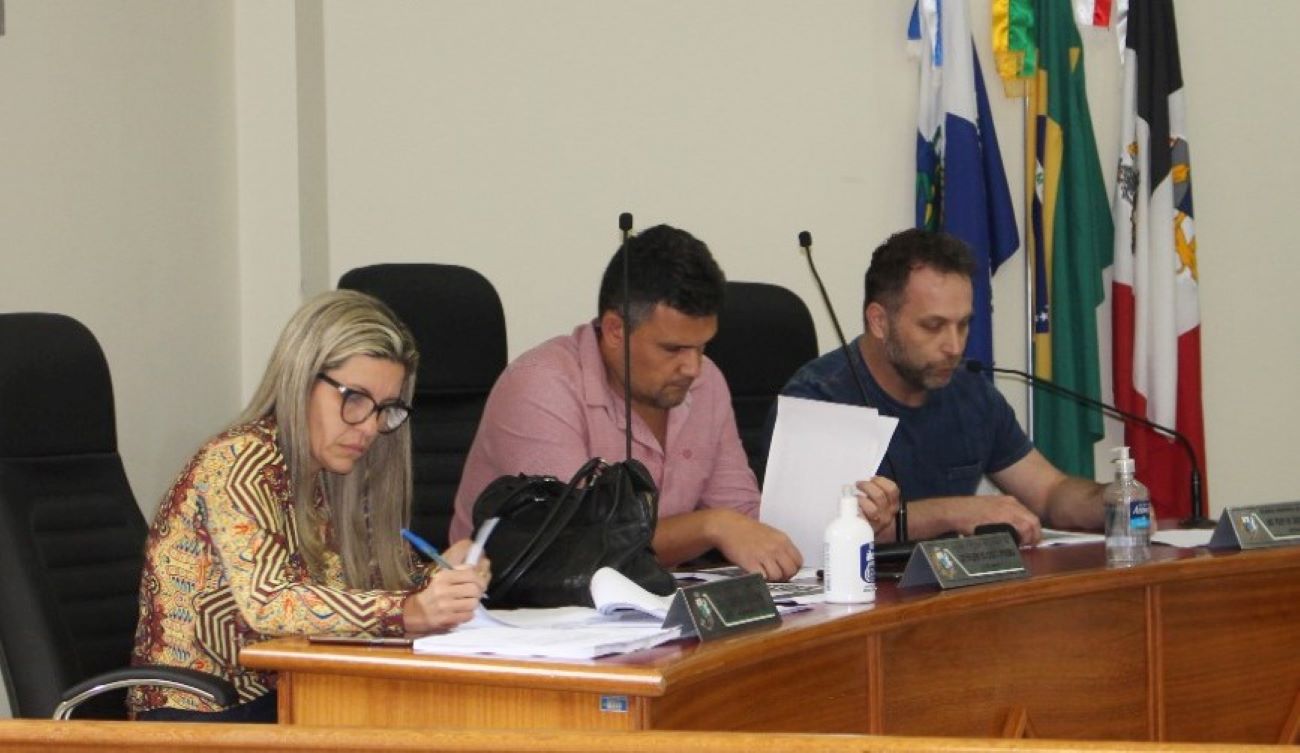 Prefeita Michelle Bianchini, secretário de Governo João Vitor Pontes e secretário de Fazenda Julio Sanches durante a exposição dos relatórios