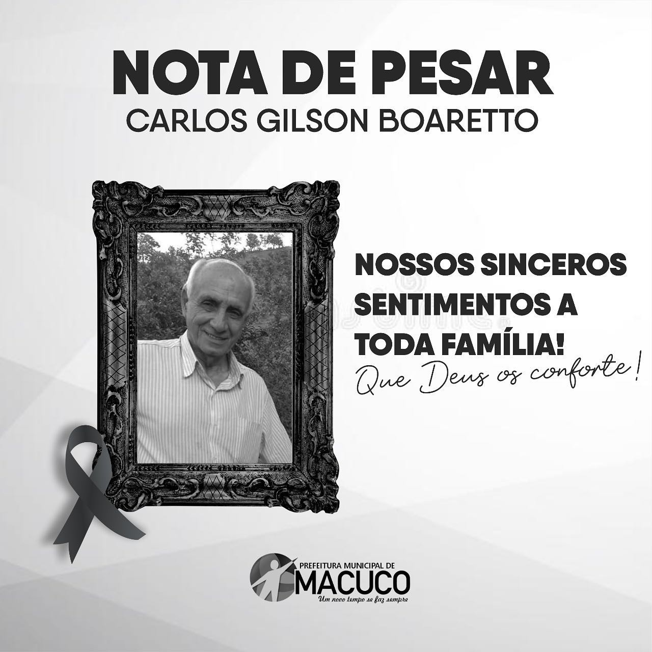 A Prefeitura de Macuco – através dos líderes da Gestão Municipal, incluindo a vice-prefeita Michelle Bianchini, secretários de Governo, Funcionalismo Municipal e se pronunciando ainda em nome da comunidade macuquense – registra suas condolências e externa sua solidariedade aos familiares e amigos do prefeito Bruno Boaretto pelo falecimento de seu pai, senhor CARLOS GILSON BOARETTO, ocorrido nesta quinta-feira, dia 02 de Dezembro de 2021.
