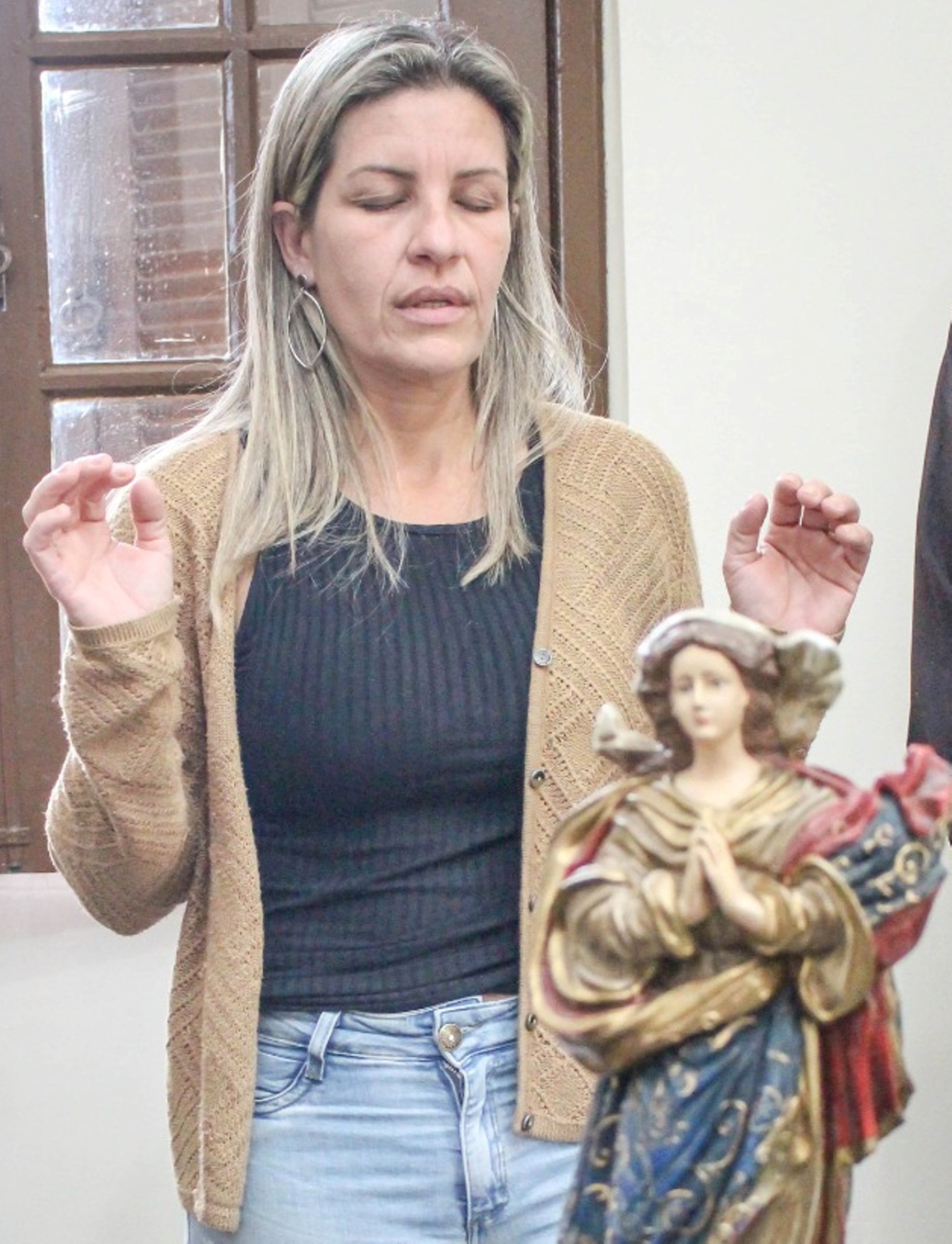 Ao lado do Padre Fernando, Michelle ficou emocionada com a presença da imagem de Nossa Senhora da Conceição