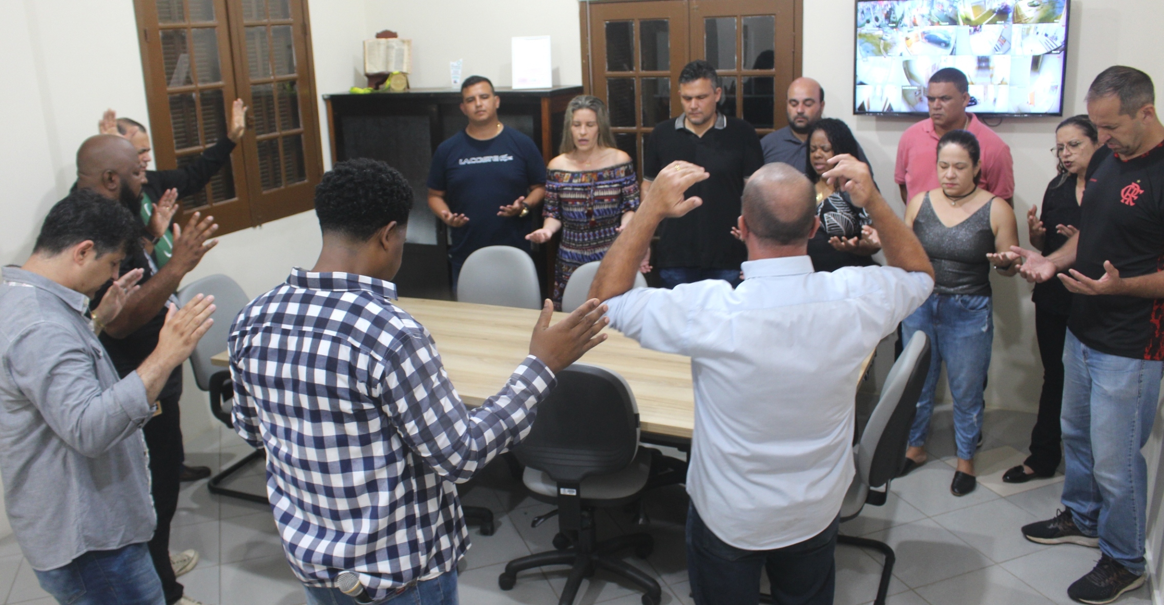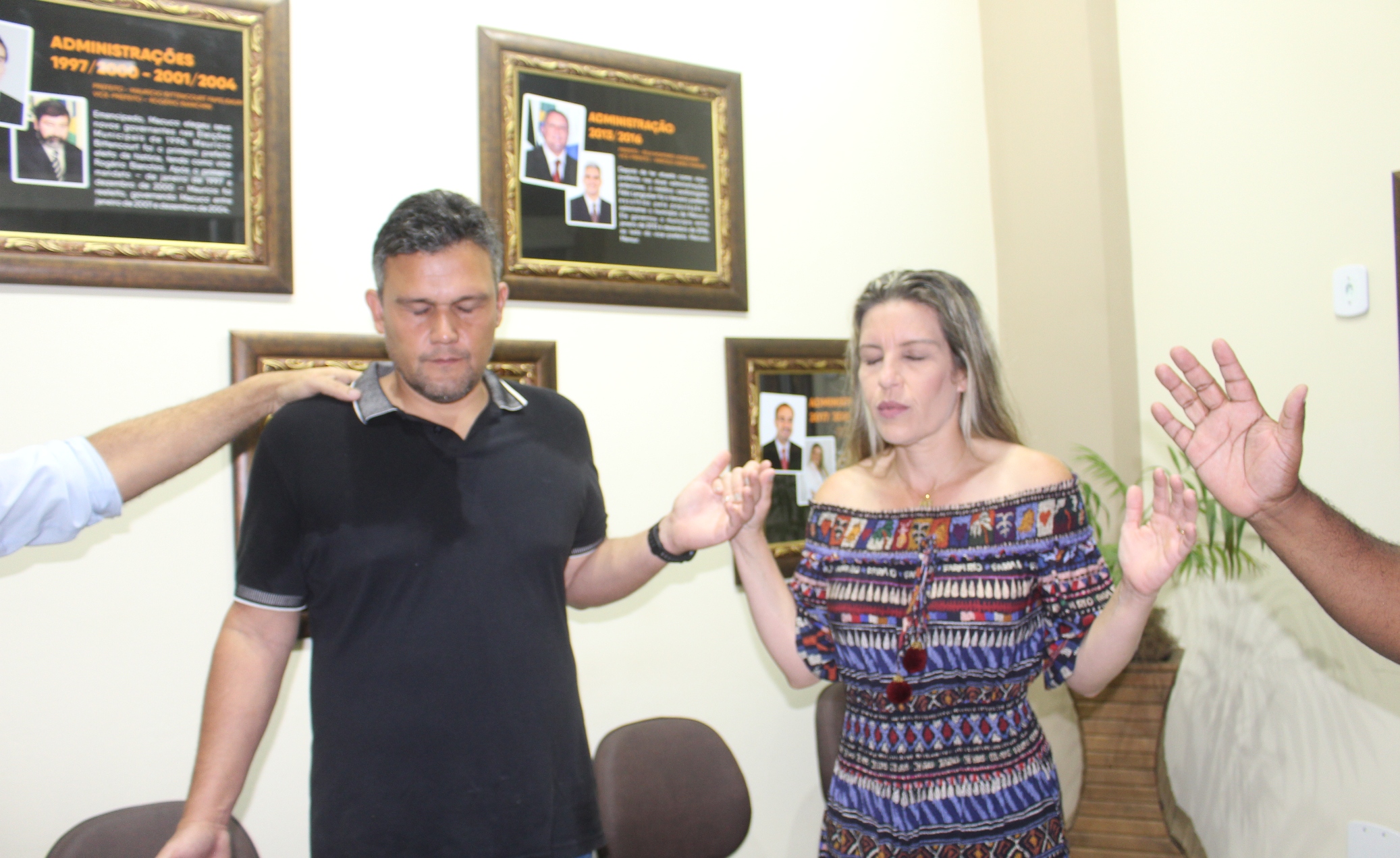 Acompanhados da prefeita Michelle Bianchini, do seu esposo e secretário de Governo João Vitor Pontes e de outras autoridades locais, pastores e lideranças evangélicas entraram na Prefeitura de Macuco e fizeram leituras bíblicas e orações em cada setor no intuito de abençoar todas as dependências, fato que se repetiu na Câmara Municipal, sede do Poder Legislativo Macuquense, tudo testemunhado pelos munícipes.