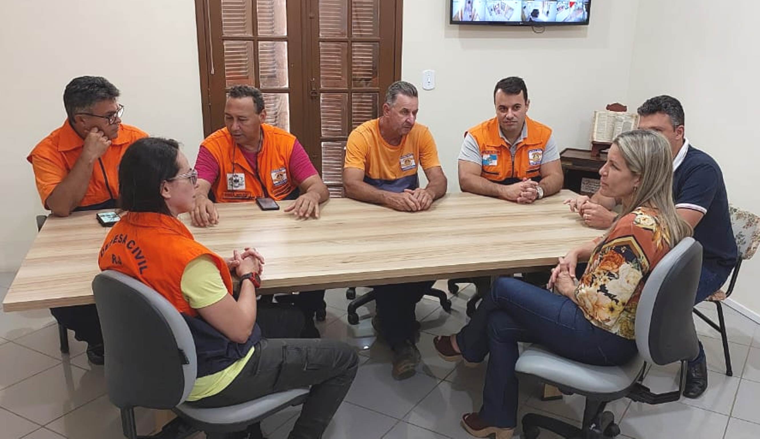 Prefeita, secretário de Governo e demais integrantes da Defesa Civil ouvem a coordenadora da REDEC, Tenente Coronel Silvia Lima (de costas)