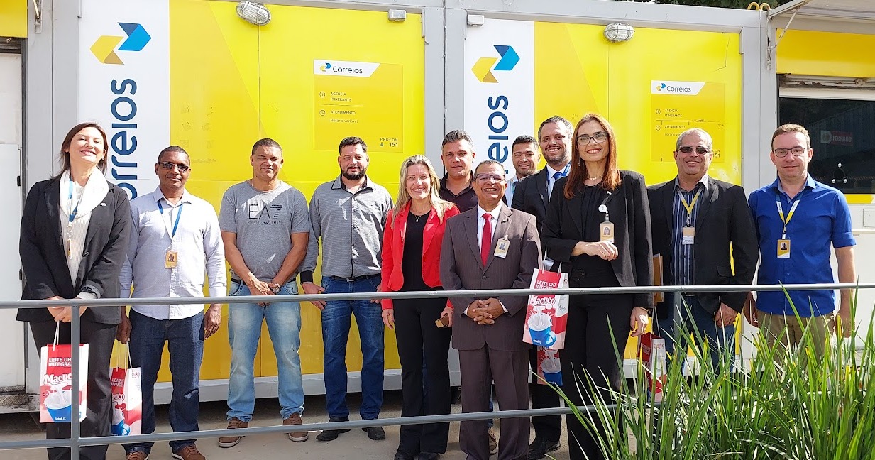Prefeita Michelle Bianchini, secretário João Vitor Pontes e vereadores Alberto Herdy e Bruno Miranda posam ao lado da equipe dos Correios