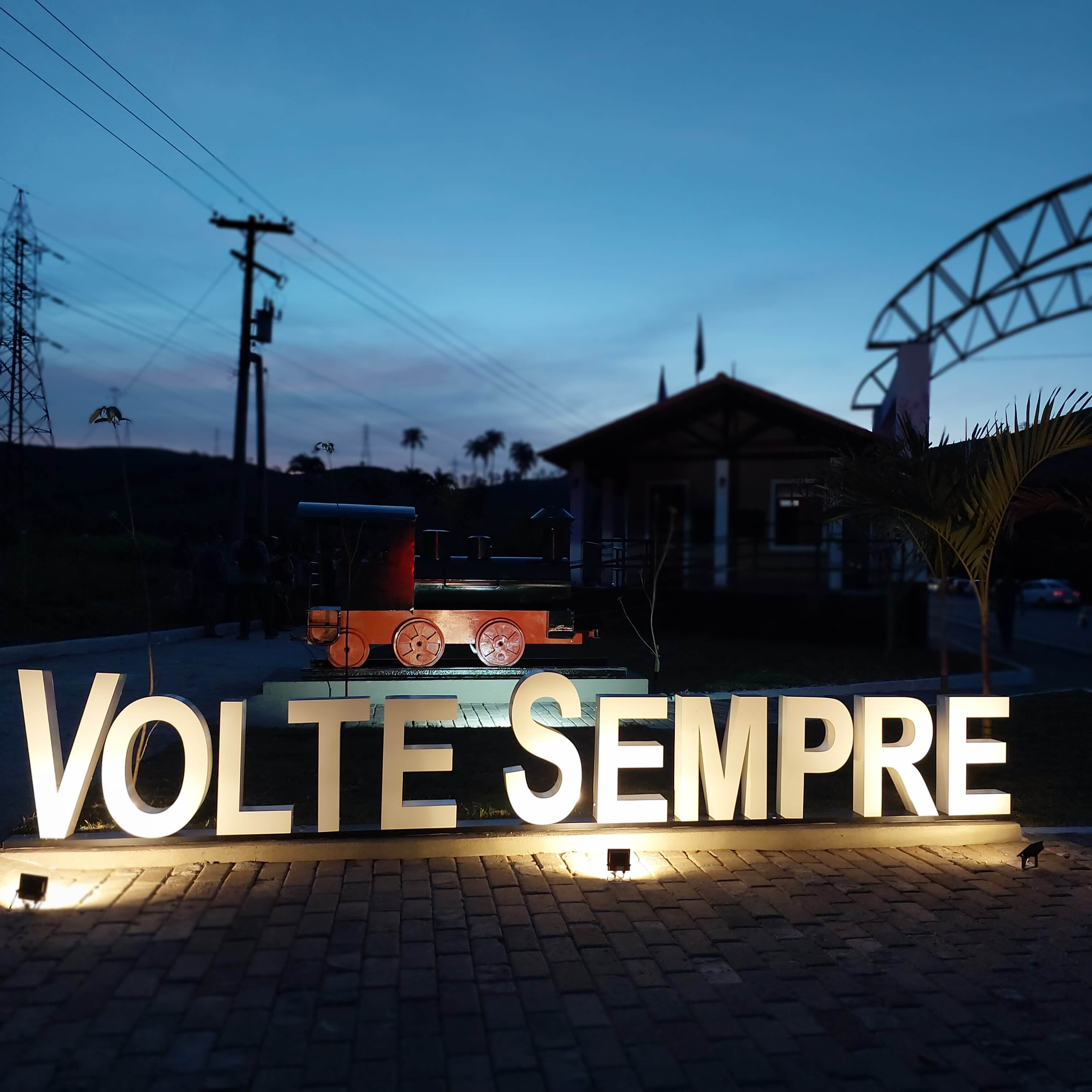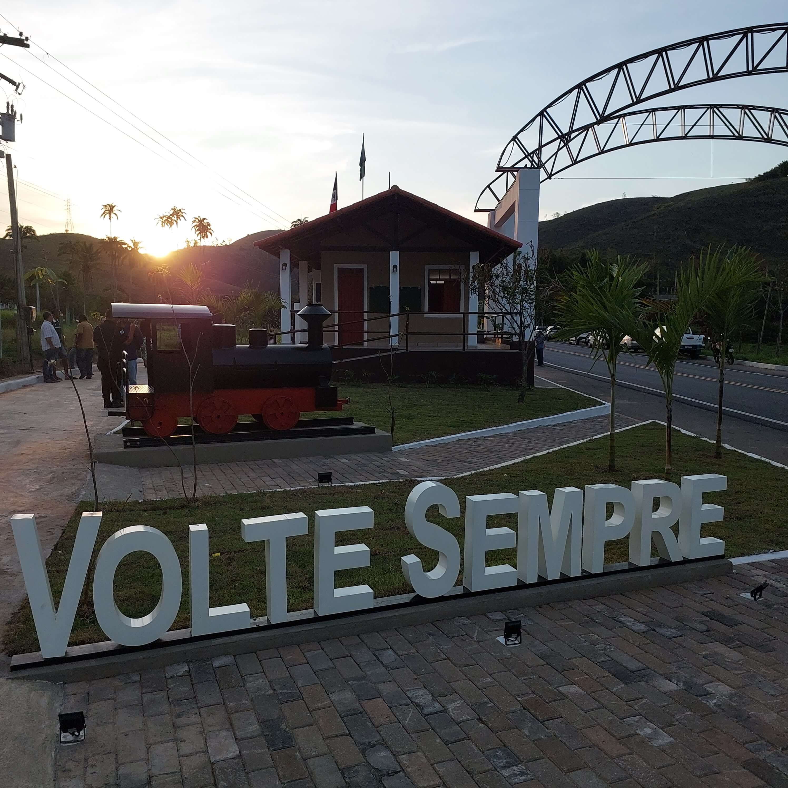 Uma réplica da extinta ‘Maria Fumaça’, o trem que fez parte da história do município, também integra a nova paisagem do Pórtico de Macuco