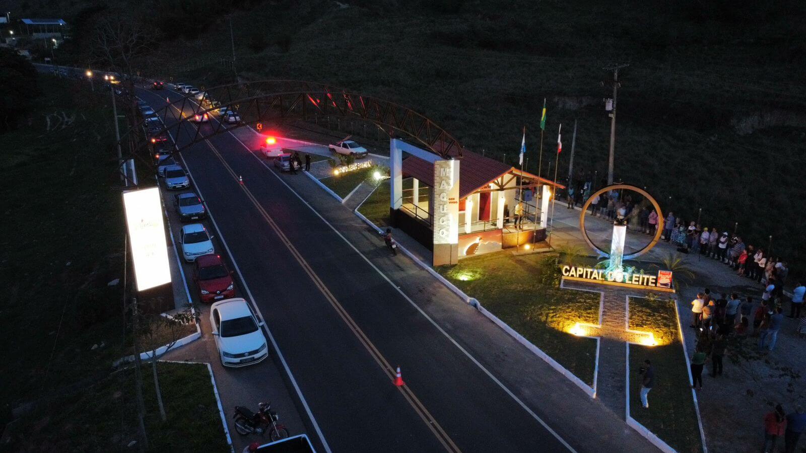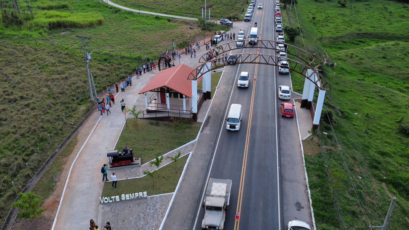 Imagem aérea do Pórtico de Entrada de Macuco momentos antes da solenidade de reinauguração do monumento na entrada da cidade