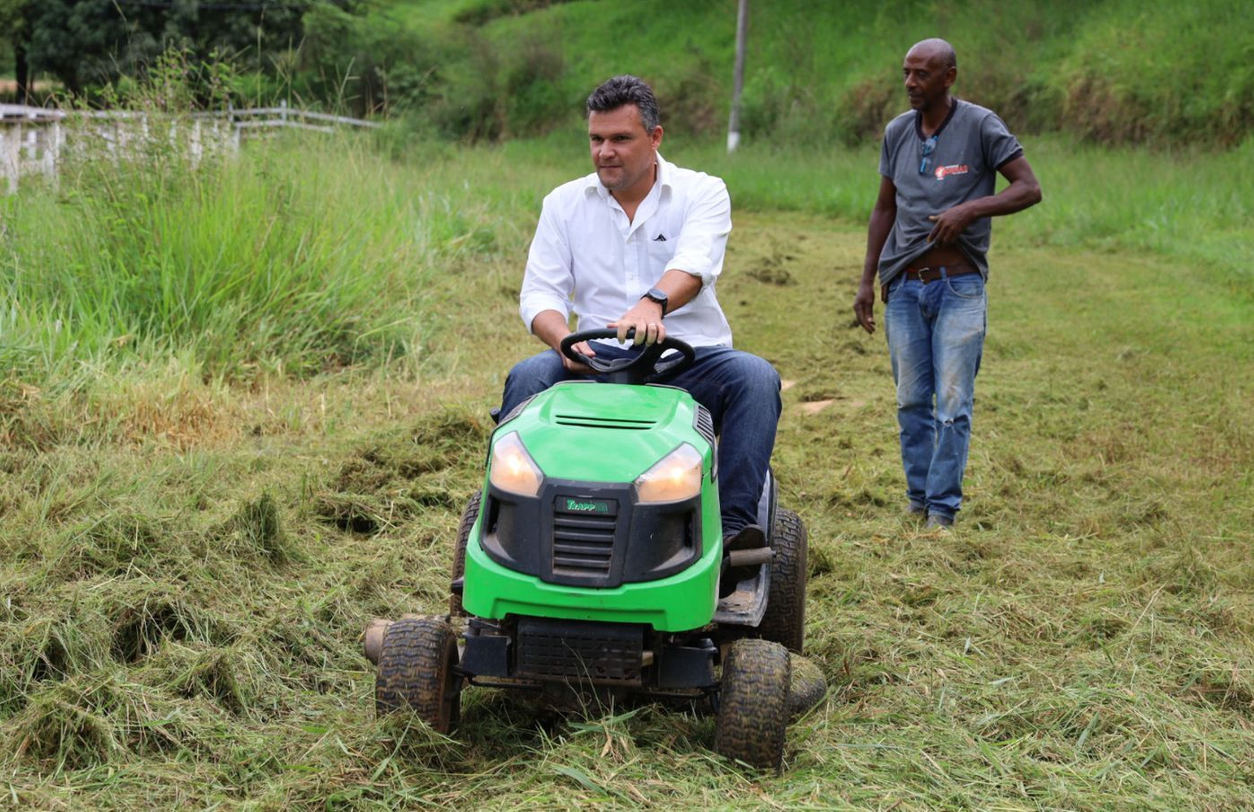 Num momento descontraído, João Vitor se tornou por alguns momentos operador da máquina roçadeira no Parque de Exposições