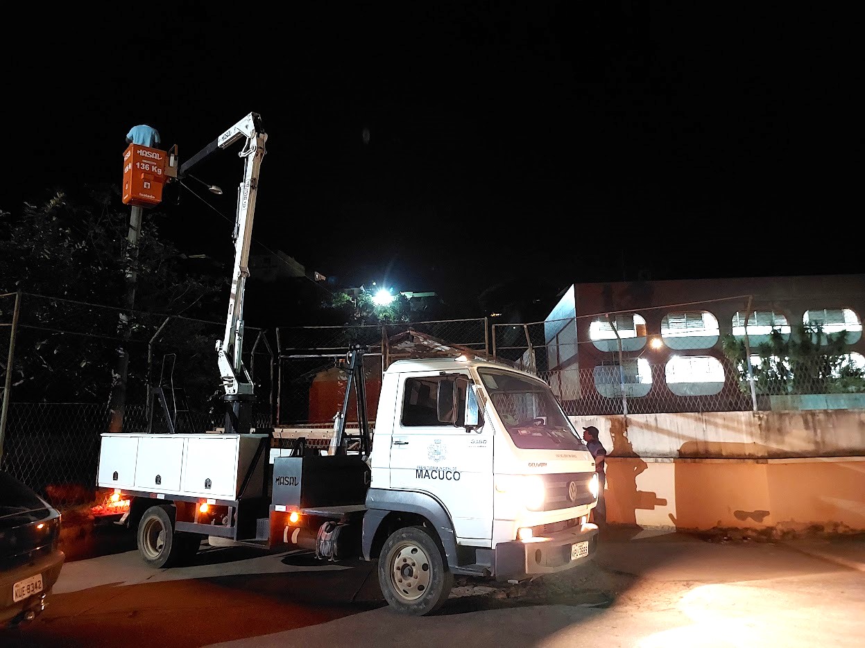 Caminhão da Prefeitura de Macuco com o cesto espacial percorreu todos os bairros no intuito de providenciar os consertos