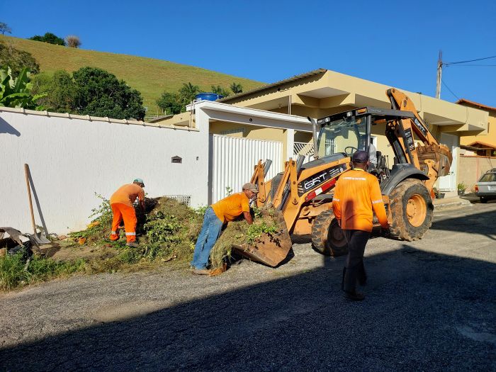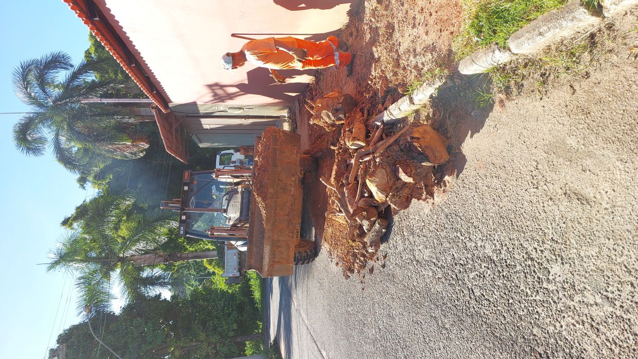 Retroescavadeira da Prefeitura de Macuco retira entulhos de uma das ruas do bairro Nova Macuco