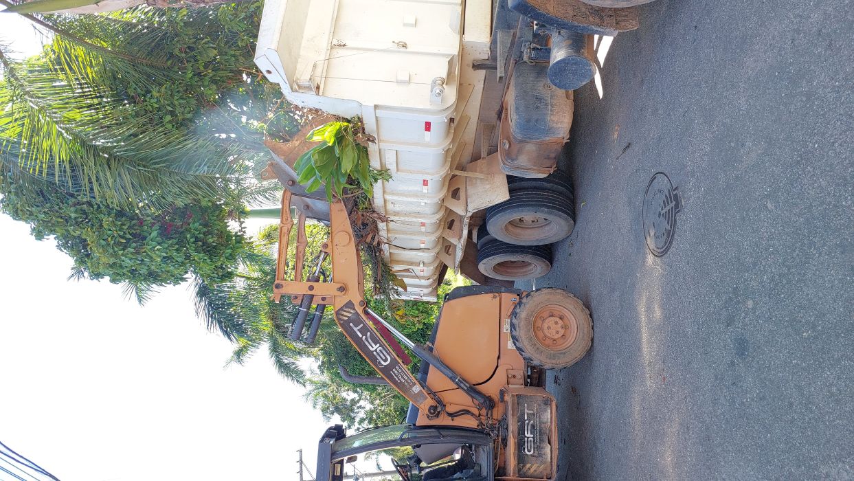 Retroescavadeira e caminhão atuando durante a ação realizada no primeiro dia útil do mês de março