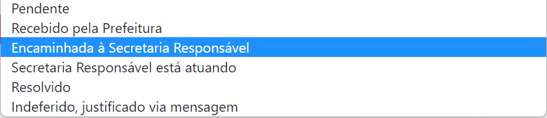 PENDENTE: Prefeitura ainda não visualizou a requisição / RECEBIDO PELA PREFEITURA: Prefeitura visualizou a requisição e está decidindo a secretaria responsável / ENCAMINHADA À SECRETARIA RESPONSÁVEL: Prefeitura já encaminhou para a secretaria encontrar a solução / SECRETARIA RESPONSÁVEL ATUANDO: Secretaria tomando as medidas para sanar o problema / RESOLVIDO: o problema foi solucionado / INDEFERIDO: o problema não cabe ao órgão municipal ou está em desacordo com a legislação. Então, uma mensagem com a justificativa será enviada ao número cadastrado no sistema.