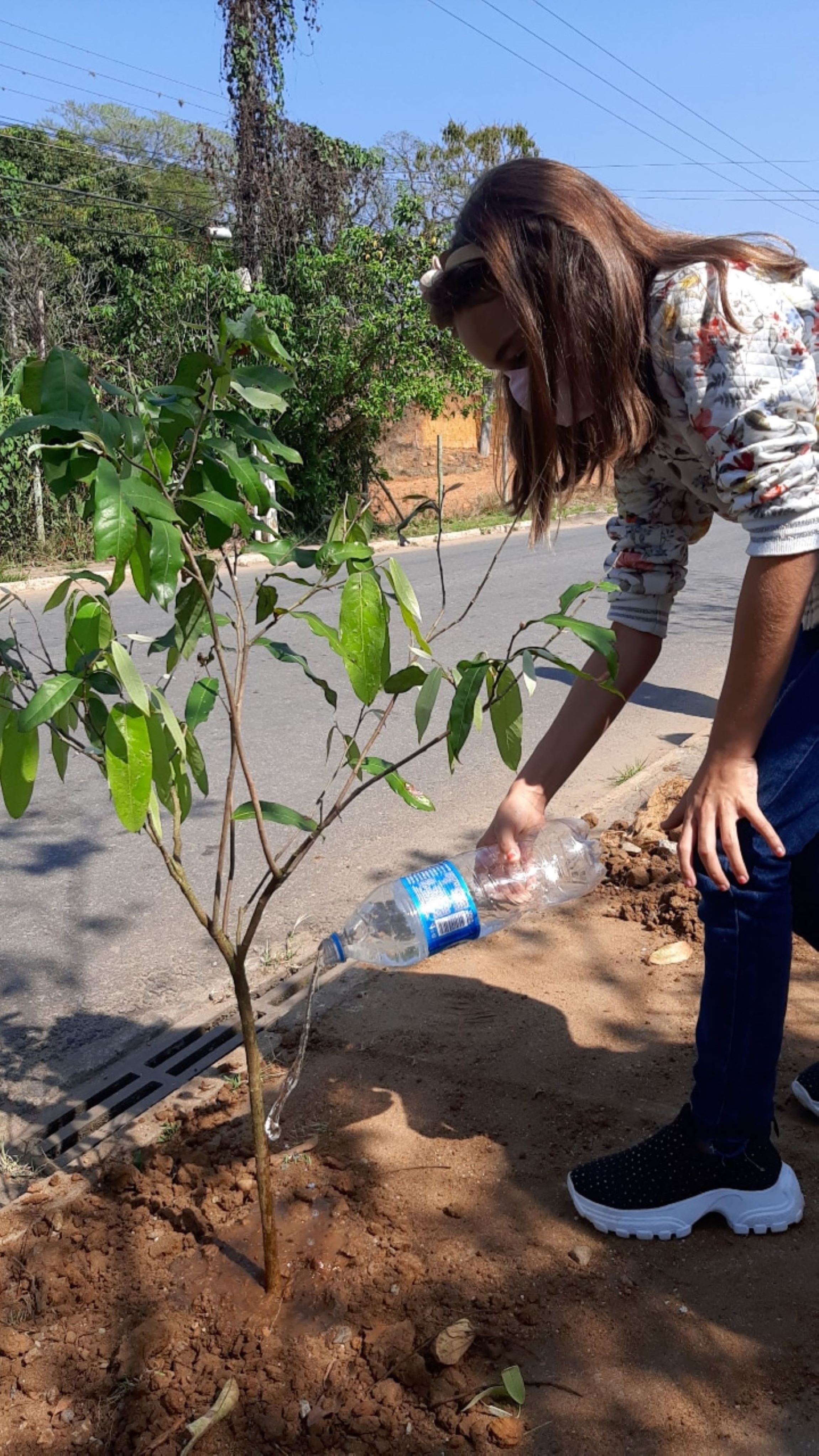Estudante rega a muda de Oiti após o seu plantio nas proximidades do CIEP Municipalizado Honório Peçanha