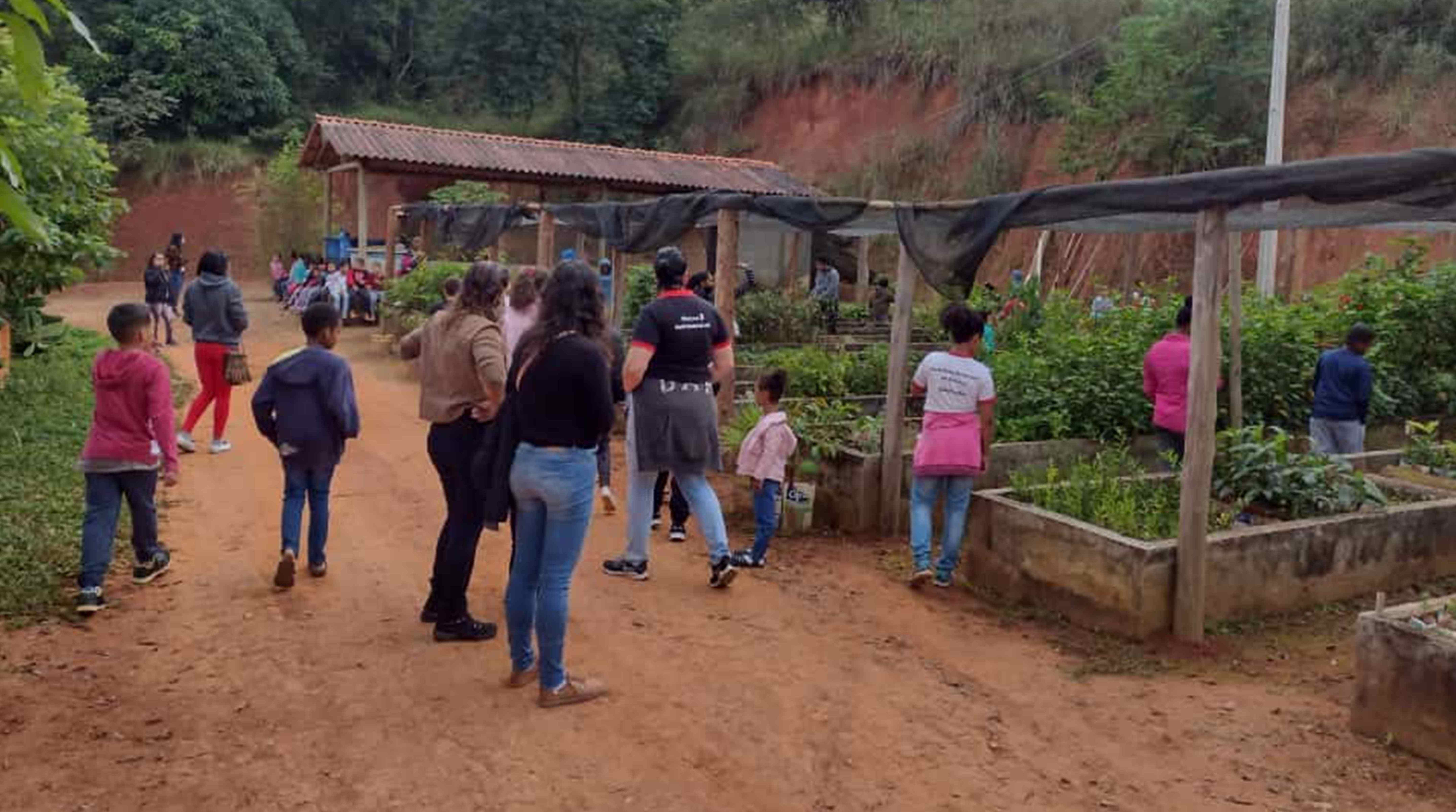 Estudantes, diretoras, professoras, equipes do horto e da Secretaria de Meio Ambiente em total integração