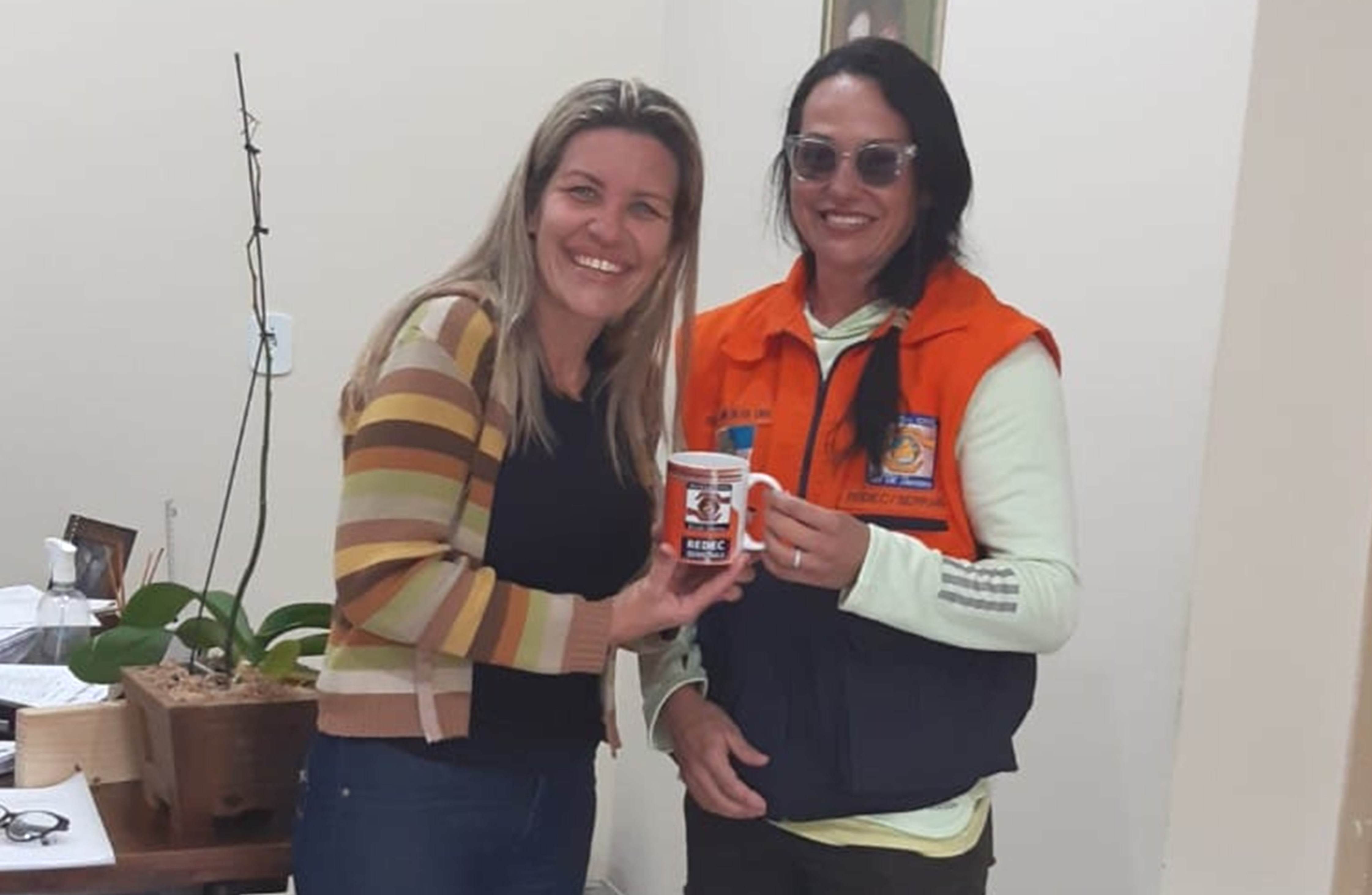 Coordenadora da REDEC/SERRANA II, a Tenente Coronel Silvia presenteou a prefeita Michelle com uma caneca personalizada