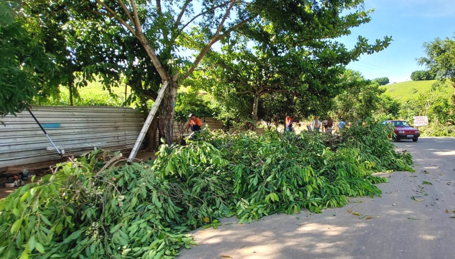 À esquerda da ponte de acesso ao bairro da Glória, integrantes da Defesa Civil de Macuco atuando na poda das espécies