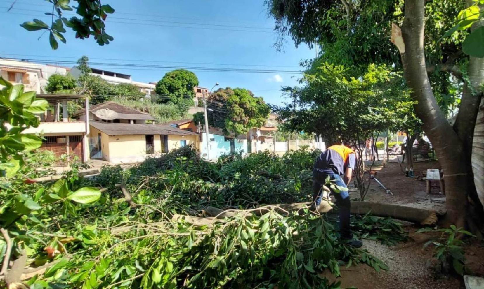 O volume grande de galhos e folhas das árvores no chão comprova que a ação deu trabalho à Coordenadoria de Defesa Civil
