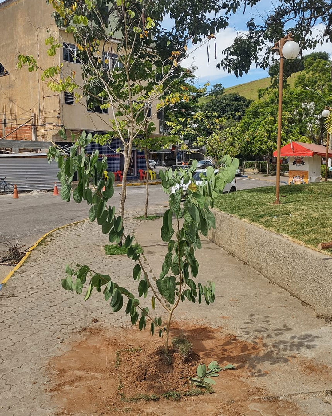 Imagem de uma árvore da espécie popularmente conhecida 'pata de vaca' plantada hoje já obedecendo a técnica de condutores