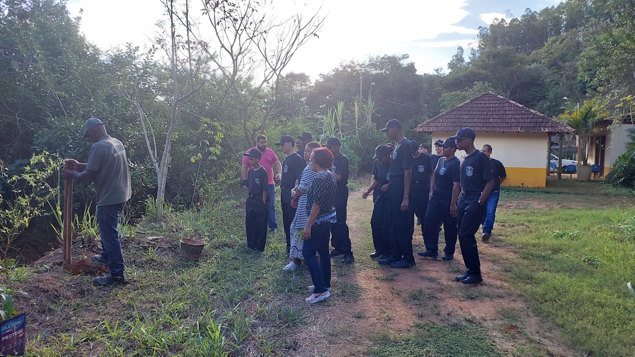 Momento em que a garotada da Guarda Municipal aguarda Seu Armando efetuar o plantio da primeira muda nativa do dia