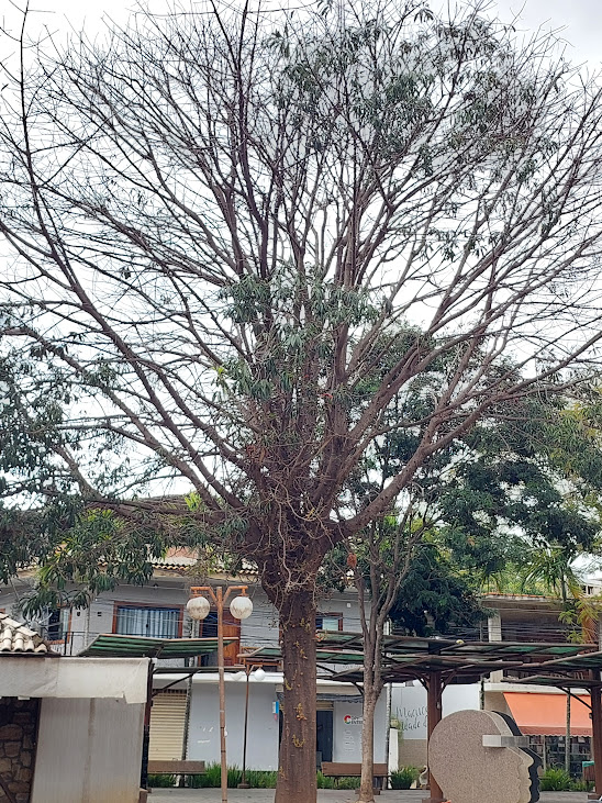 Outra árvore que costuma ser abrigo e espaço para construção de ninhos das aves está localizado na praça central de Macuco, em meio ao comércio local