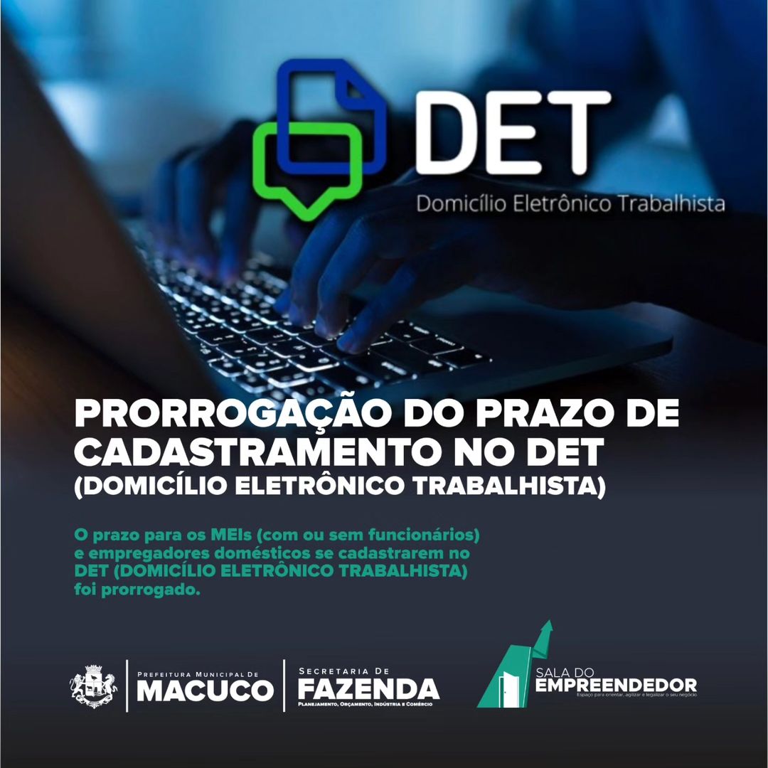 O prazo para os MEIs, com ou sem funcionários, e empregadores domésticos se cadastrar no DET (Domicílio Eletrônico Trabalhista) foi prorrogado. Não perca o prazo, procure a Sala do Empreendedor até 01 de agosto de 2024.