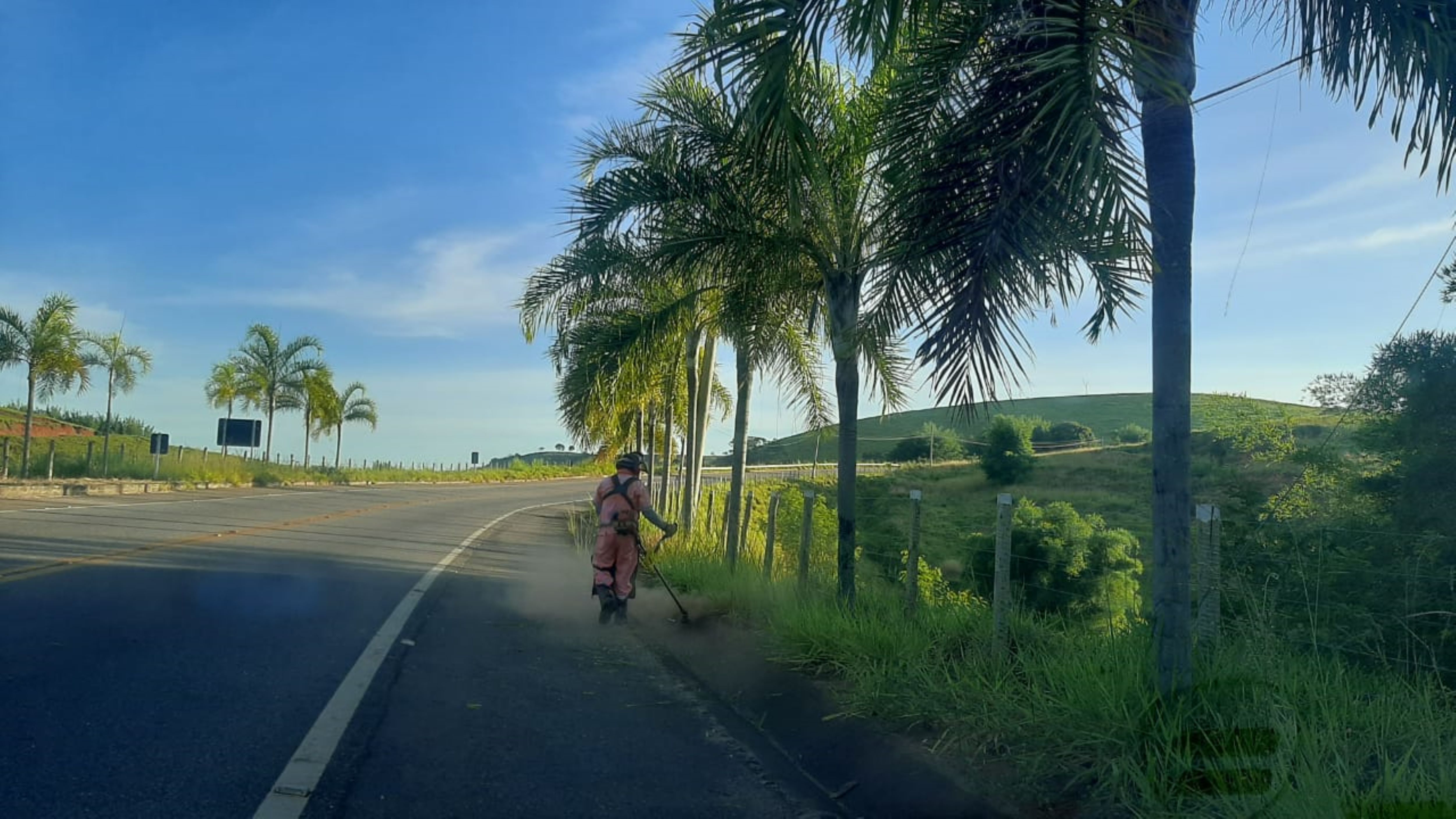 Profissional atuando com uma roçadeira na estrada da Volta da Ferradura