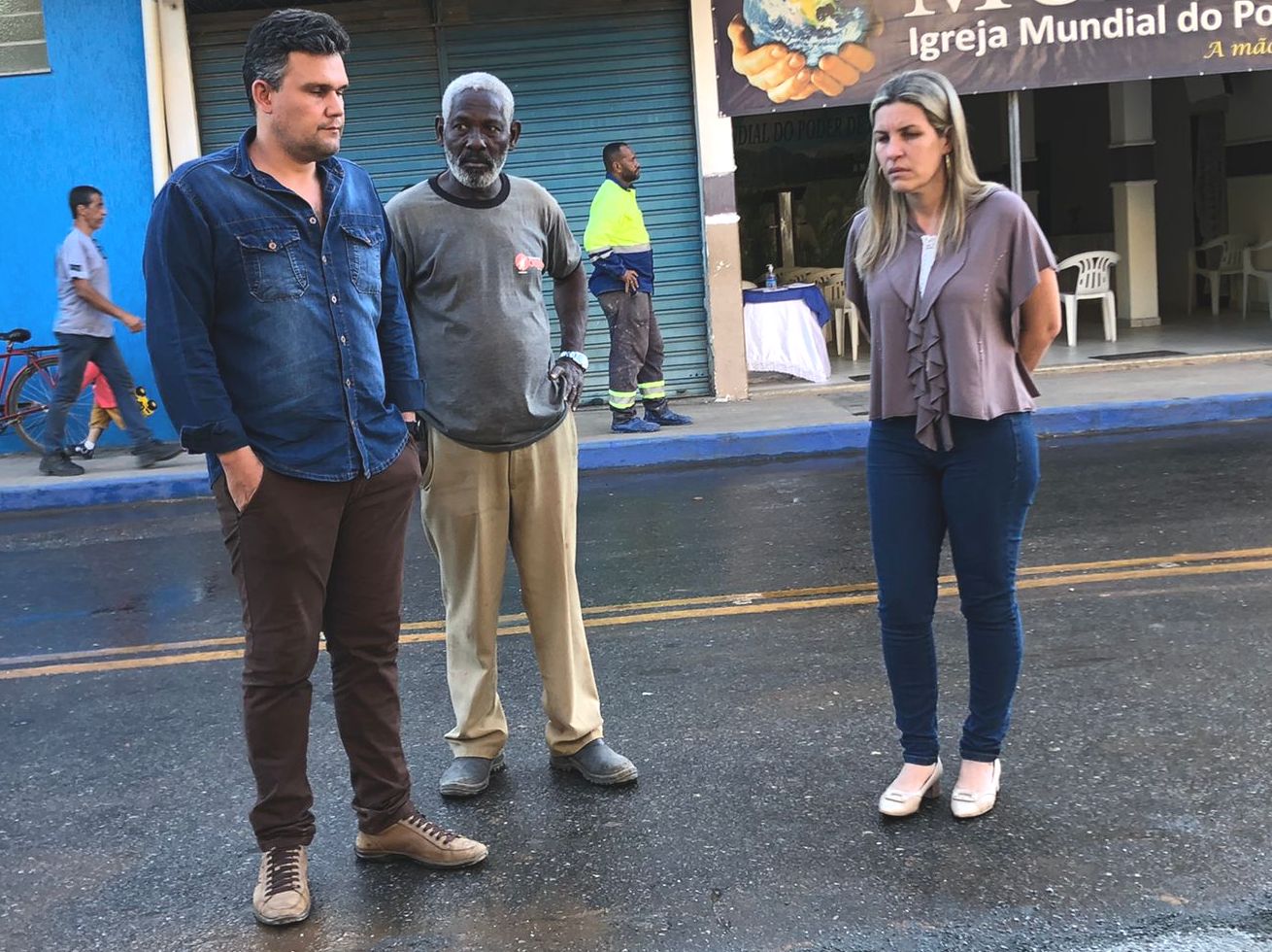 Prefeita Michelle conversa com o esposo João Vitor observada pelo secretário de Obras e um servidor municipal