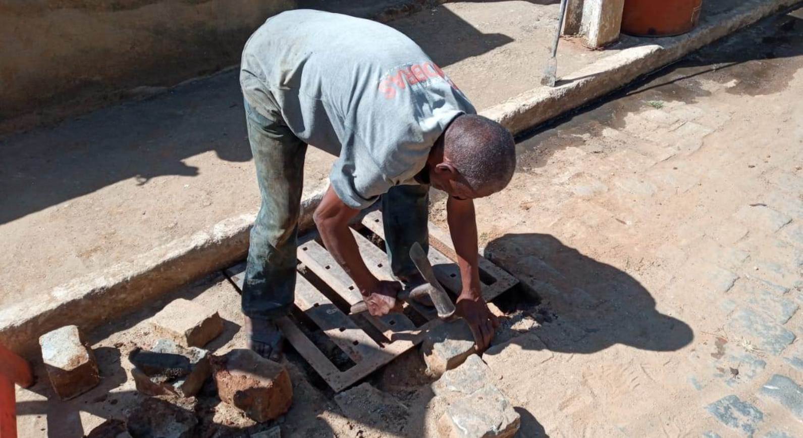 Servidor da Secretaria de Obras remove a grade de um dos bueiros para fazer os reparos necessários