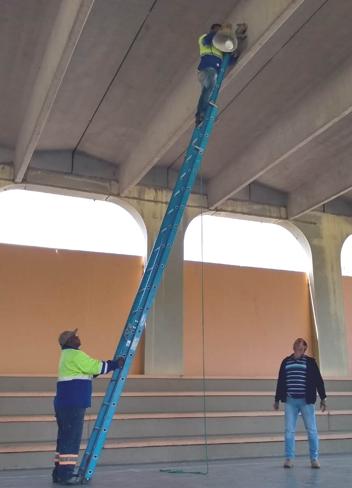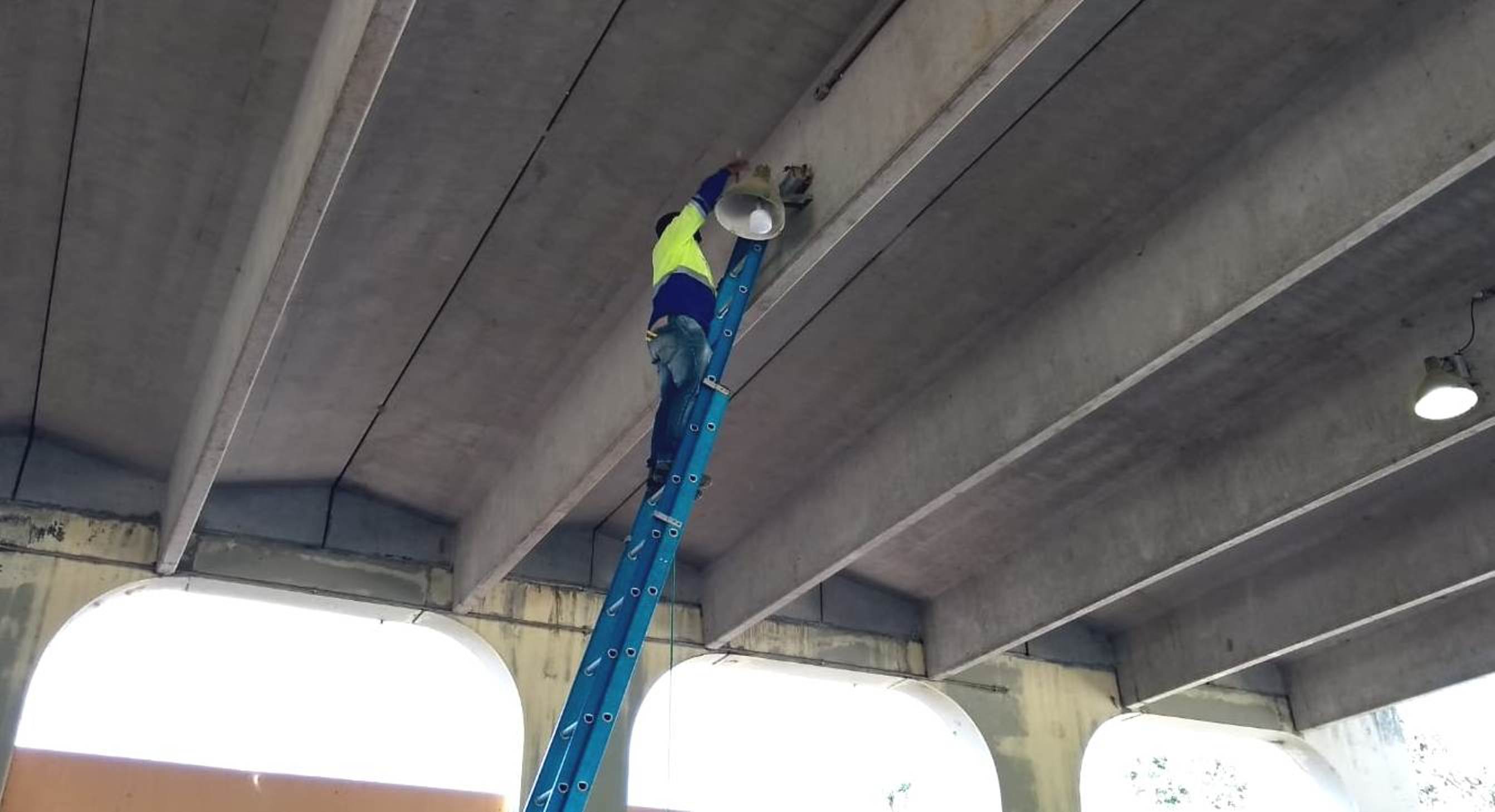 Funcionário durante a troca das lâmpadas, que após a implantação do material em LED deve melhorar a luminosidade