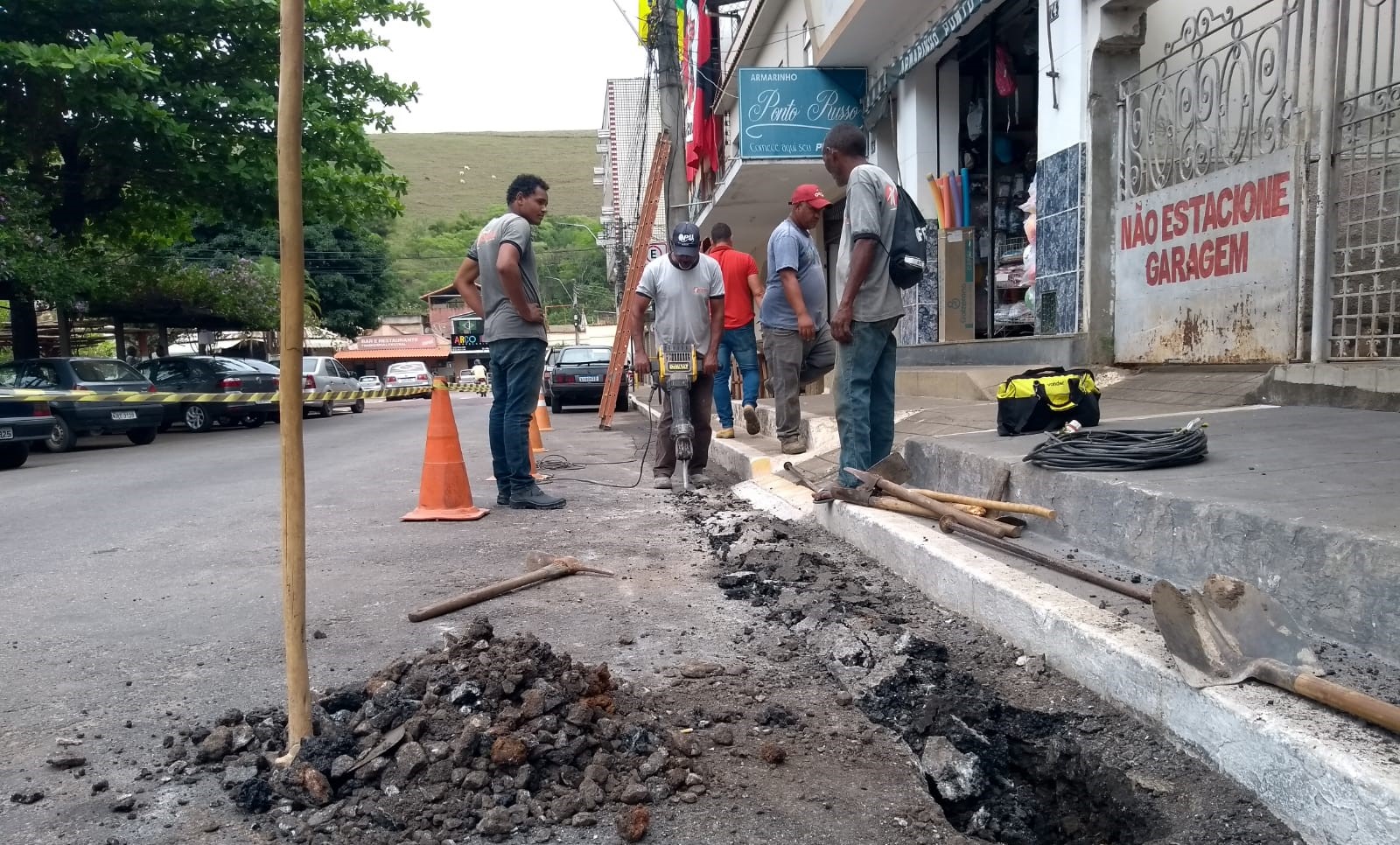 Com o auxílio de uma britadeira, funcionário inicia o corte no solo para a instalação de manilhas e dos bueiros no Centro