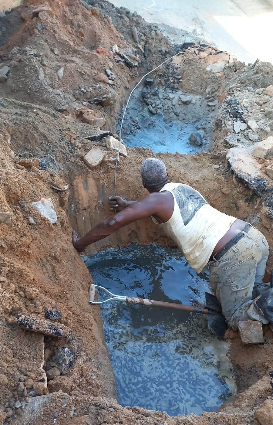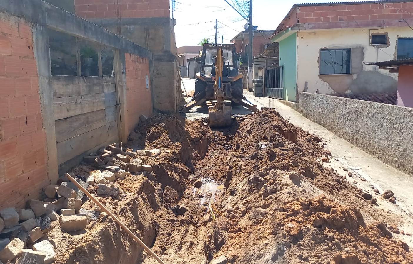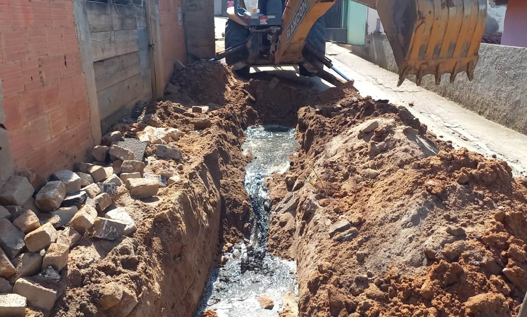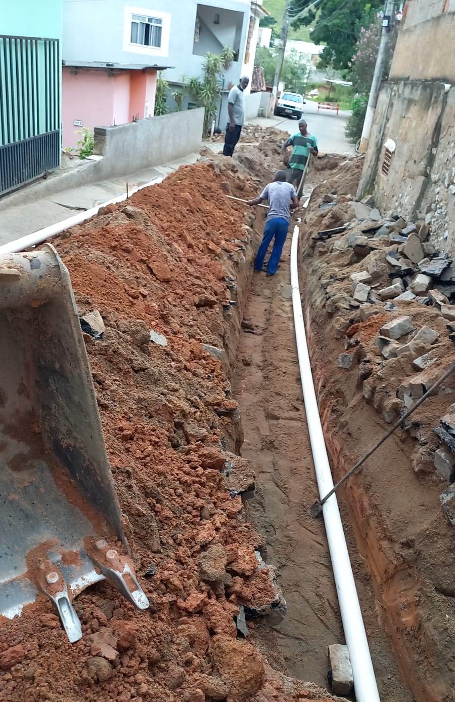 Equipe da Secretaria de Obras de Macuco abrindo espaço na vala feita pela máquina para abrigar o novo encanamento