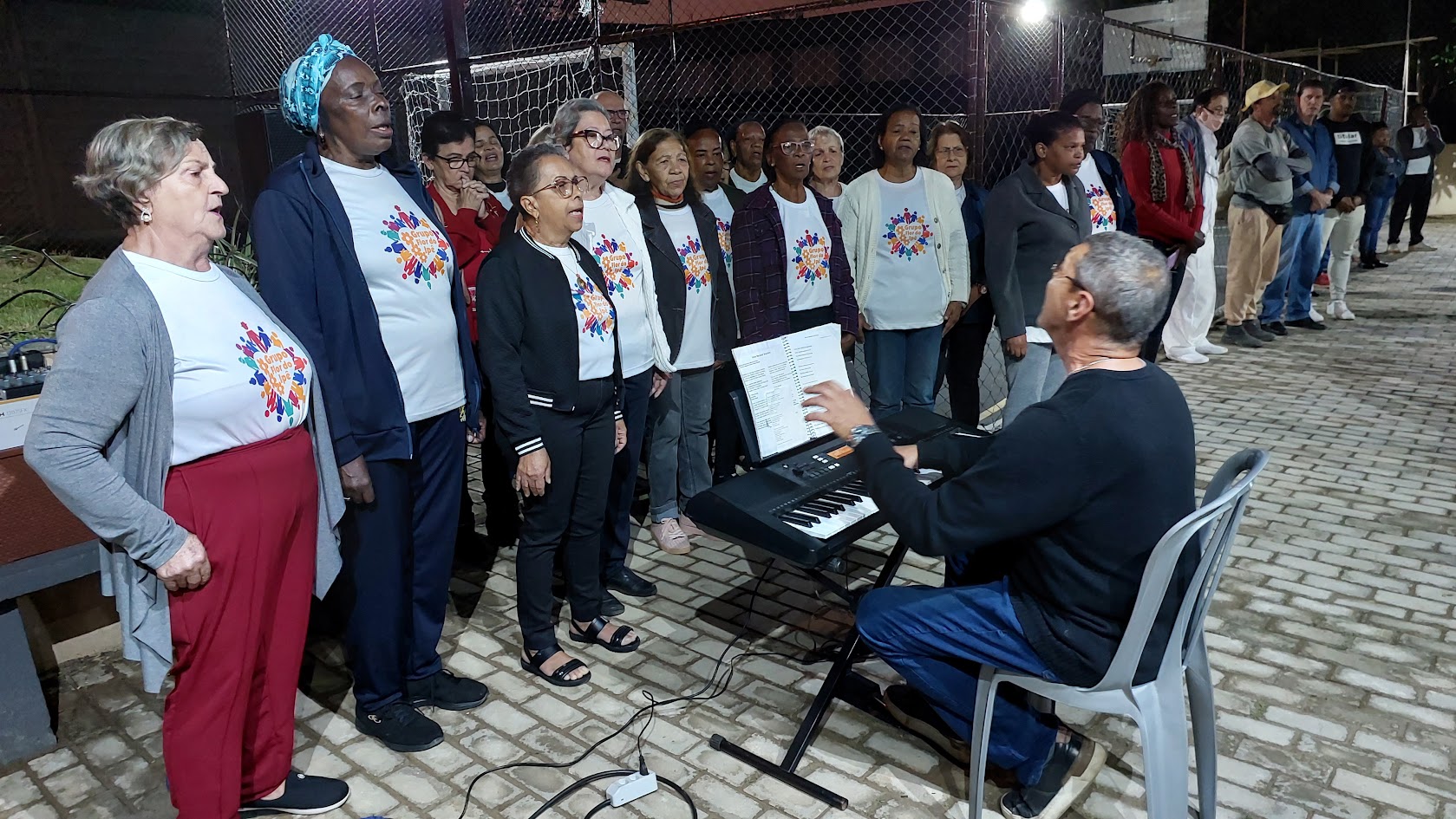 Maestro Marcelo Juliano comanda o Grupo Flor de Ipê durante a entonação dos hinos Nacional Brasileiro e do Município de Macuco