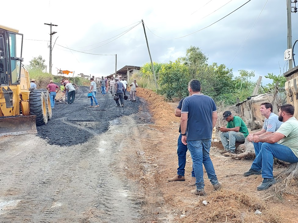 Imagem confirma a retomada dos trabalhos e o mutirão da equipe de obras mostra os esforços para dar sequência à colocação do asfalto