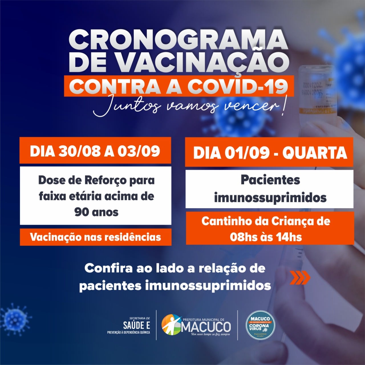Concluída a vacinação contra o coronavírus para todo o público alvo da primeira fase, Macuco iniciou esta semana a aplicação da dose de reforço (DR) para idosos e imunossuprimidos, seguindo orientações do Ministério da Saúde. Assim, desde a segunda-feira, dia 30, os profissionais de saúde que integram a equipe de imunização estão indo às residências para vacinar todos os moradores acima de 90 anos.
