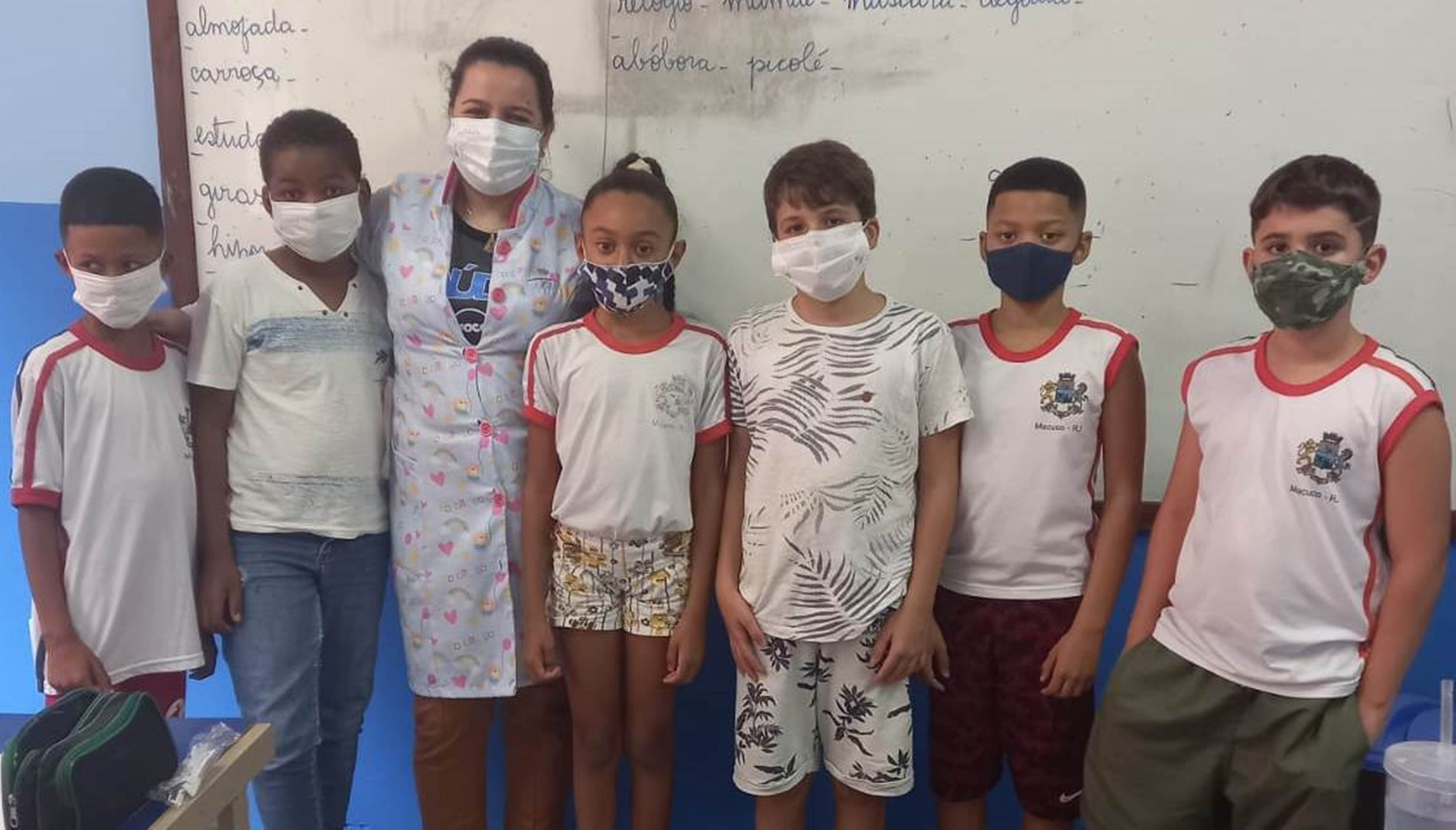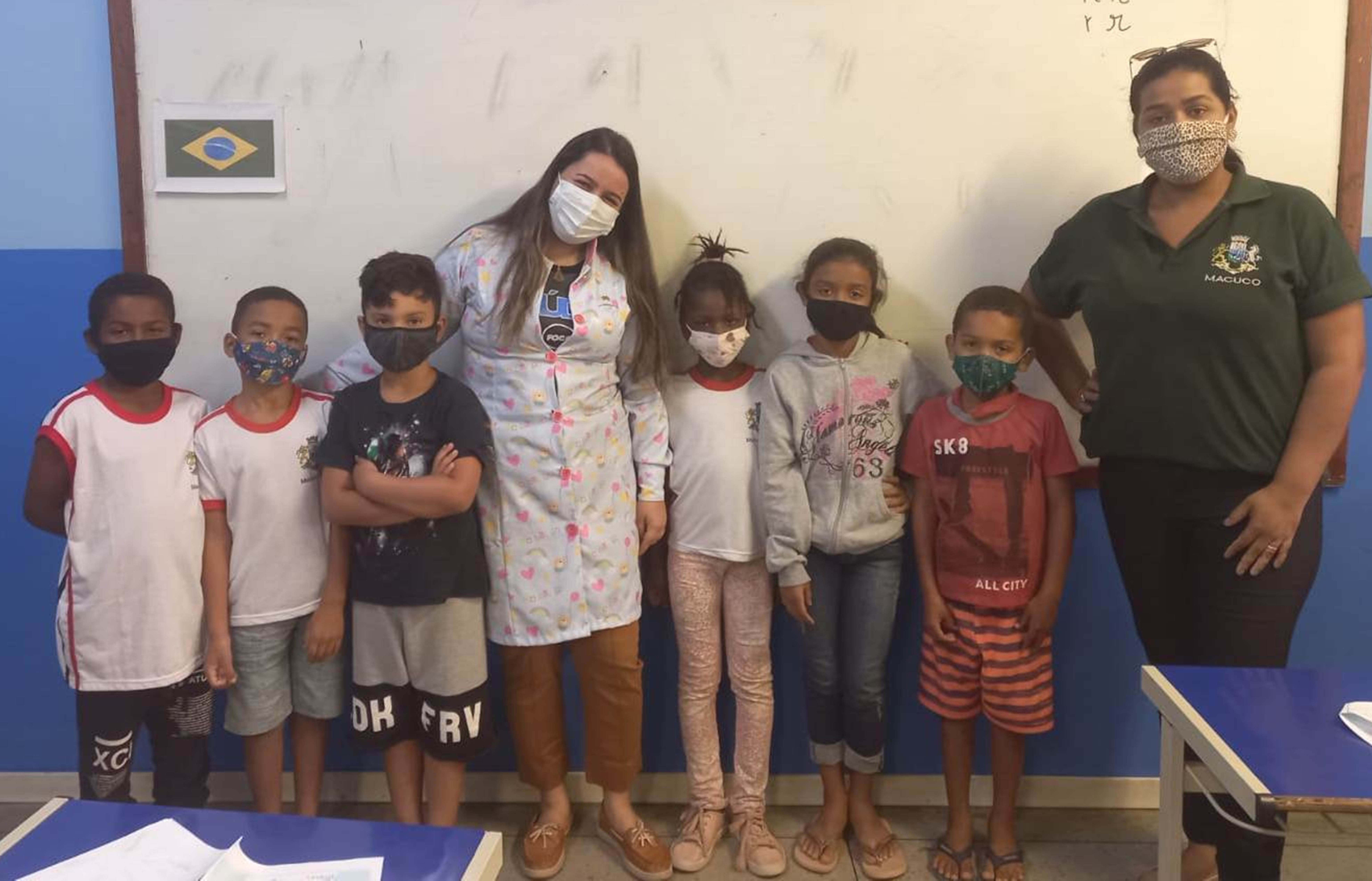 Dentista responsável pelo programa e professora com os estudantes durante a visitação feita à Escola David Coelho dos Santos