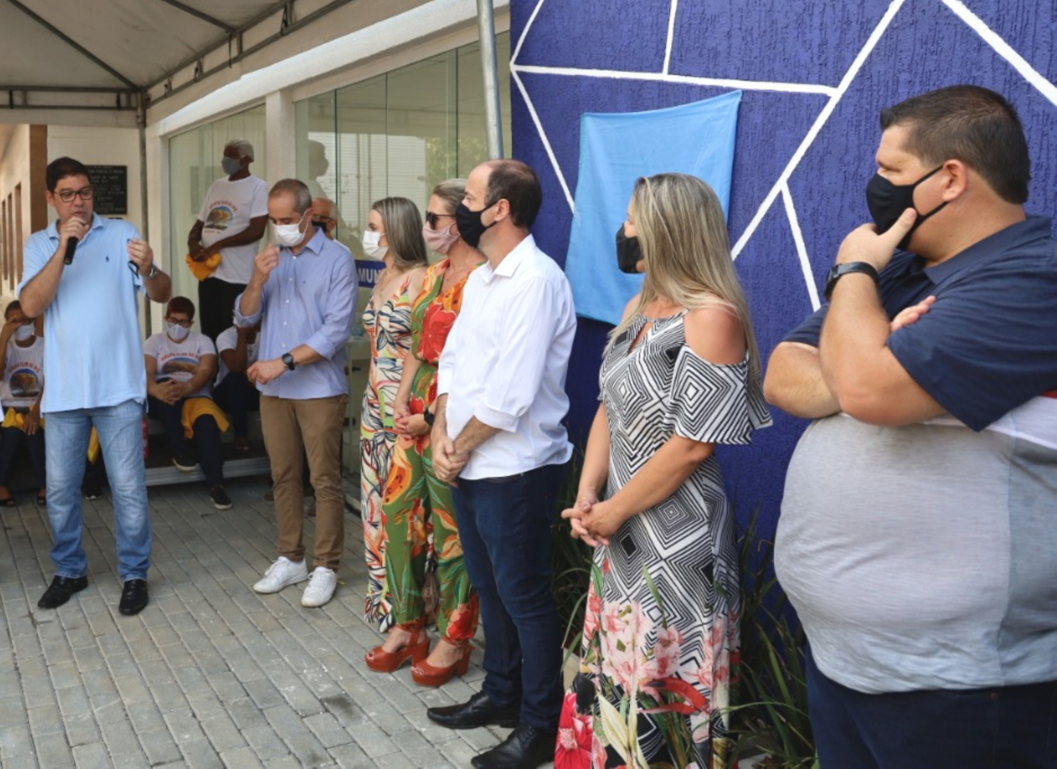 Público acompanhando a solenidade diante da porta principal do Centro de Saúde de Macuco